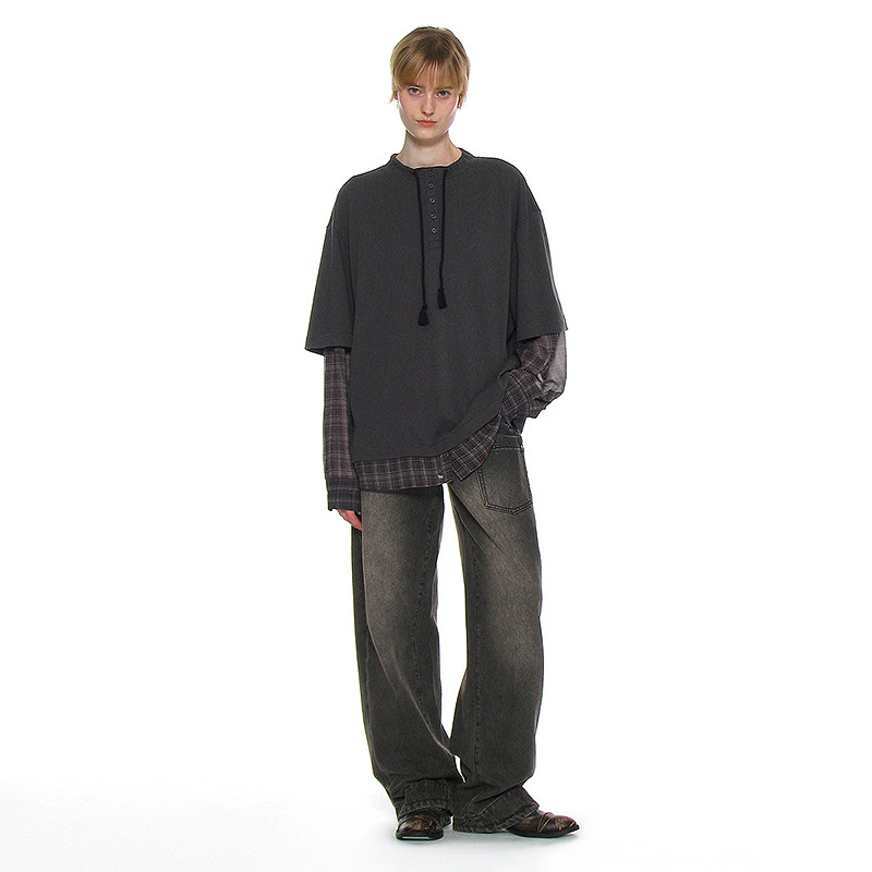 亨利领假两件格纹拼接长袖T恤