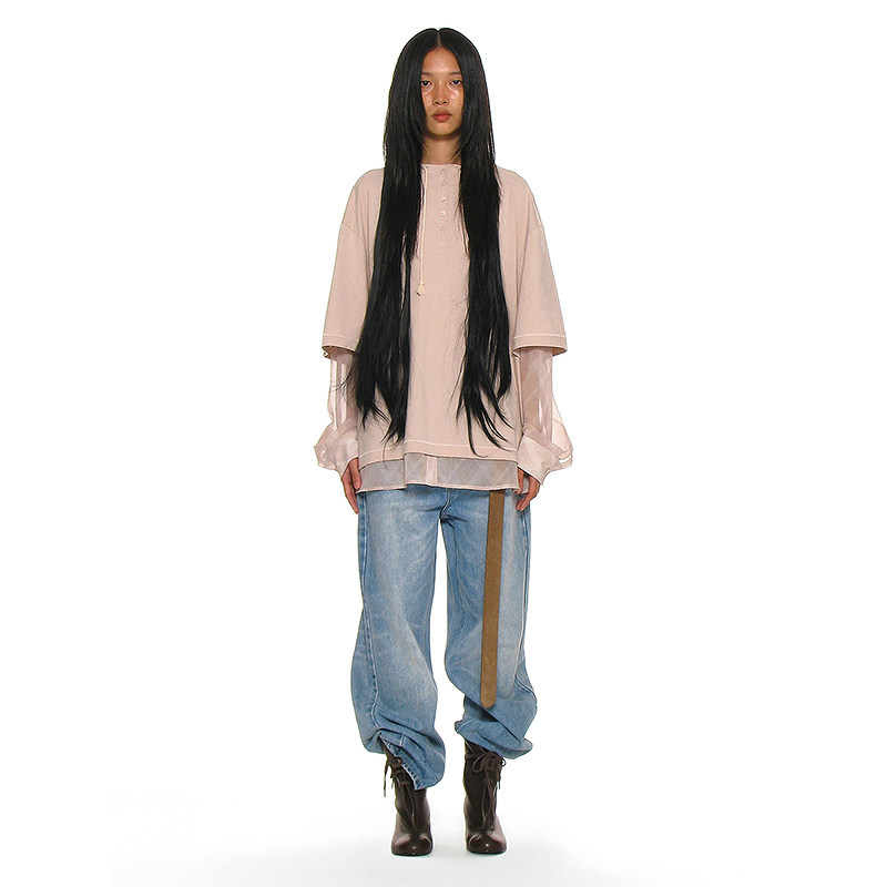 亨利领假两件长袖T恤 PARTIMENTO 圆领格纹拼接袖小众设计感上衣