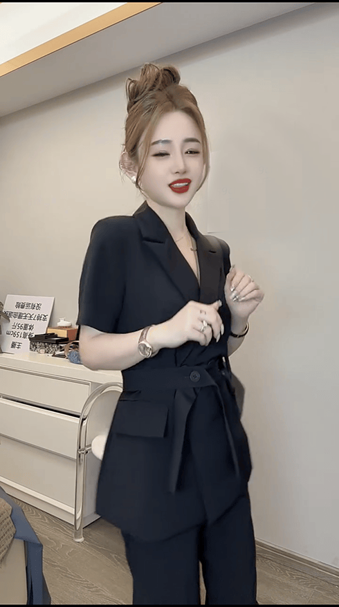高级感黑色新中式短袖西装套装女2024夏季新款气质职业西服两件套