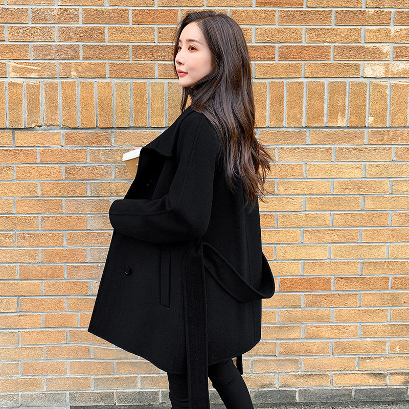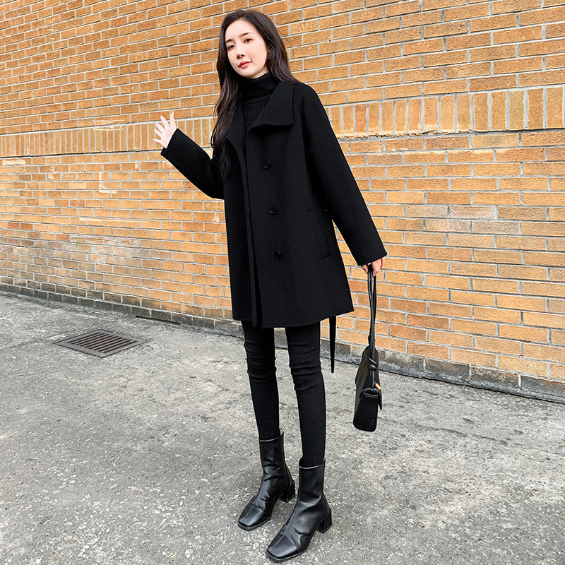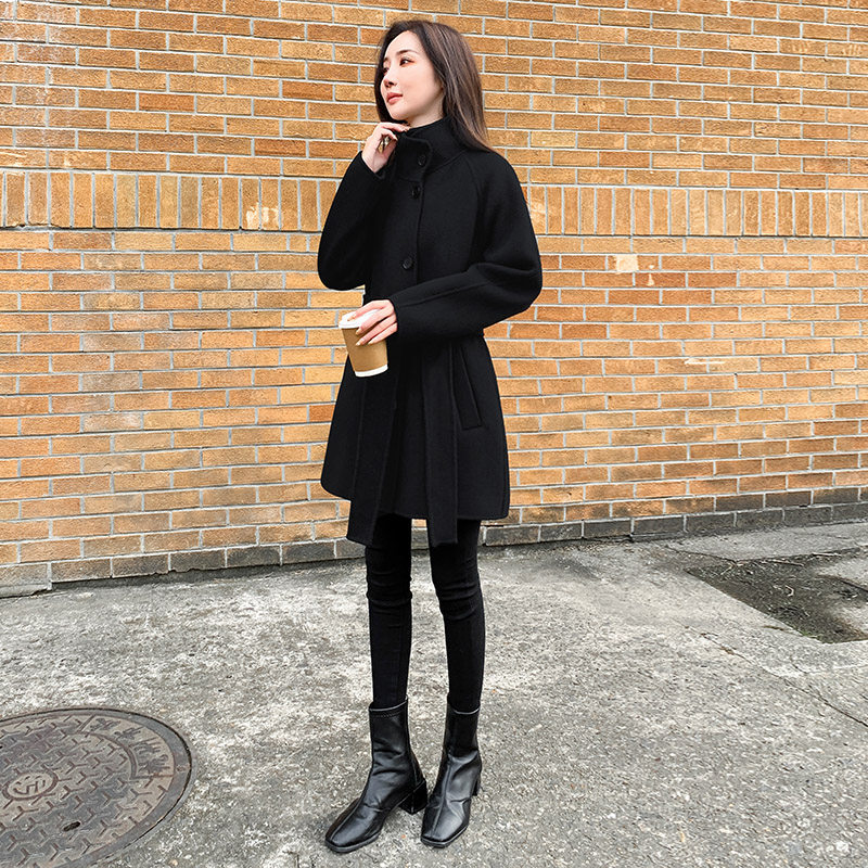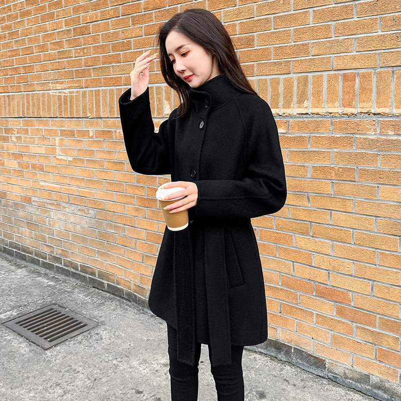 黑色双面羊绒呢子大衣2025女装秋冬小个子中长款收腰毛呢外套立领