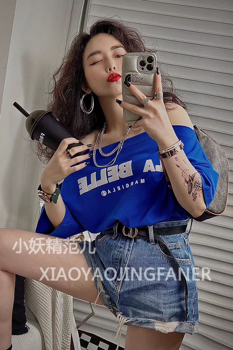 一字肩T恤女短袖夏韩国宽松显瘦一字领露肩斜肩字母印花chic上衣