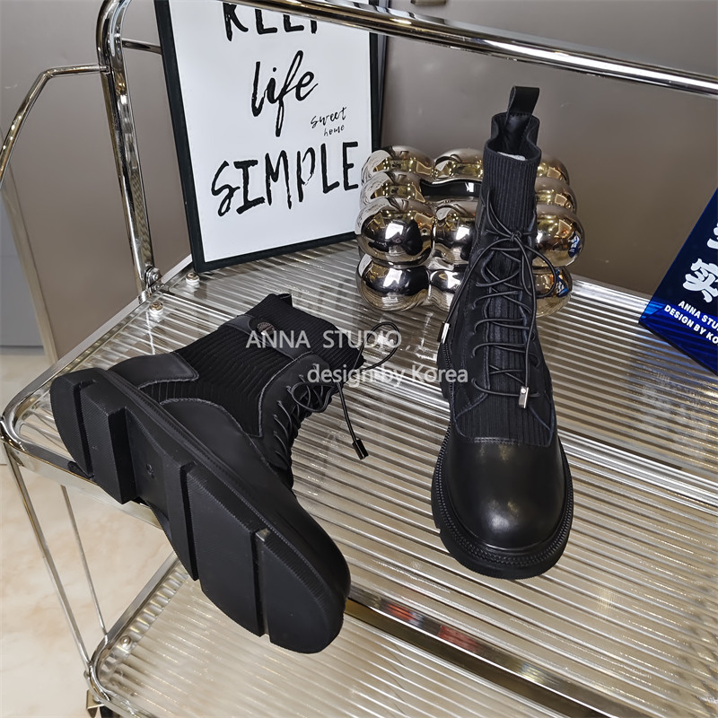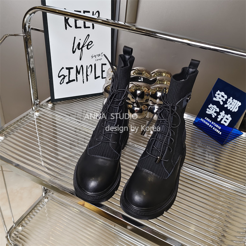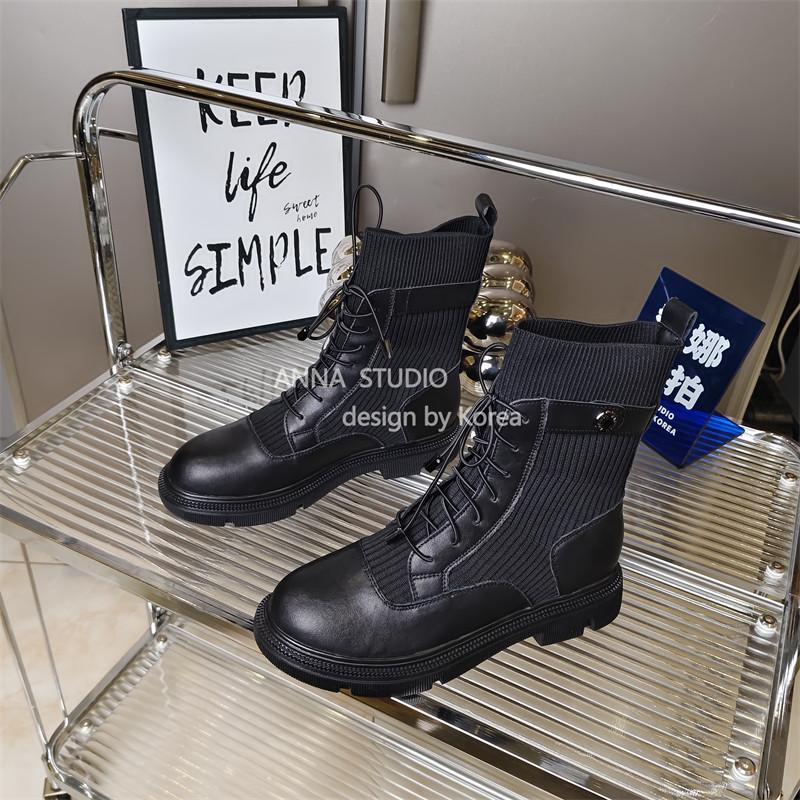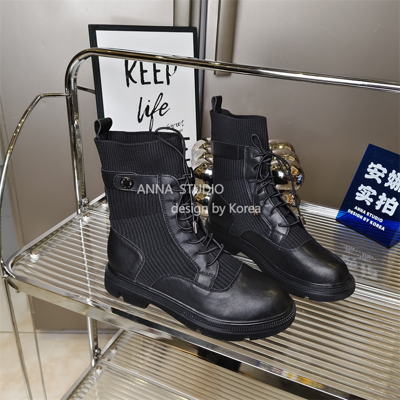 真皮商场撤柜圆头拼接针织瘦瘦靴厚底烟筒靴显廋马丁靴女低跟单靴