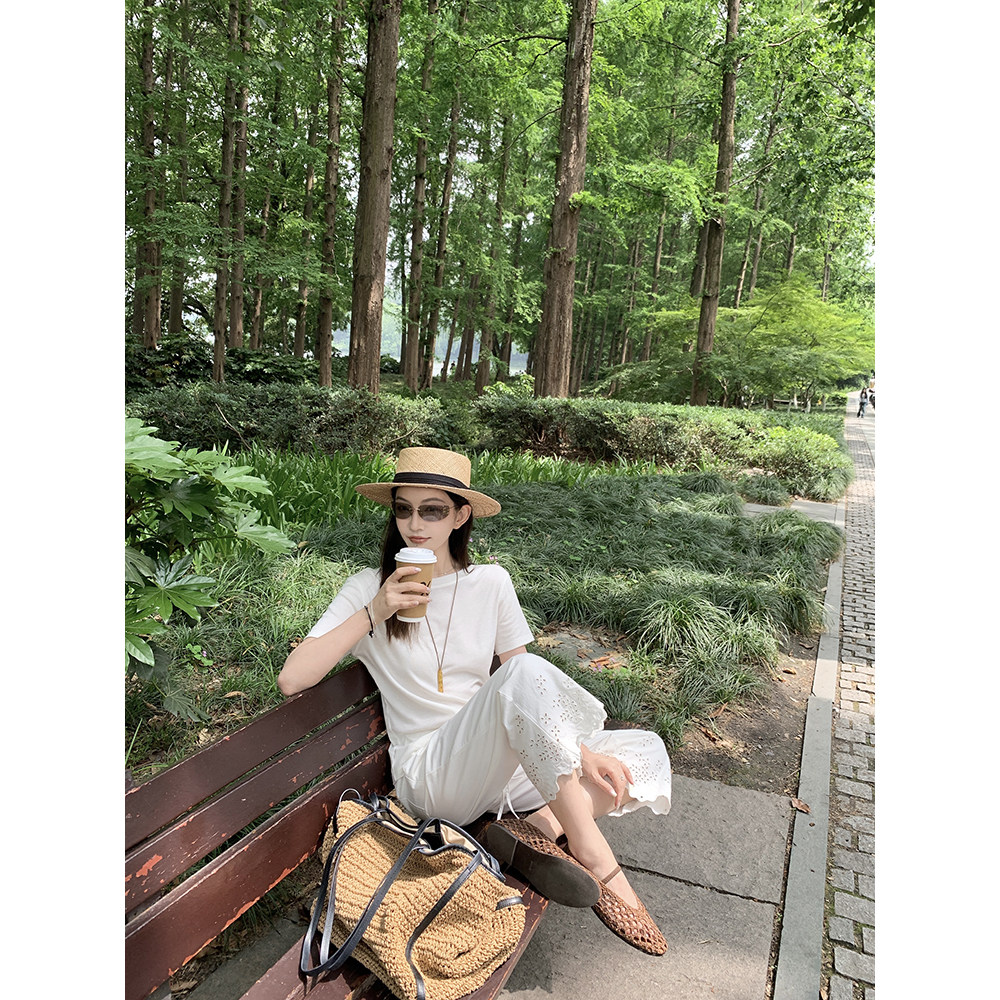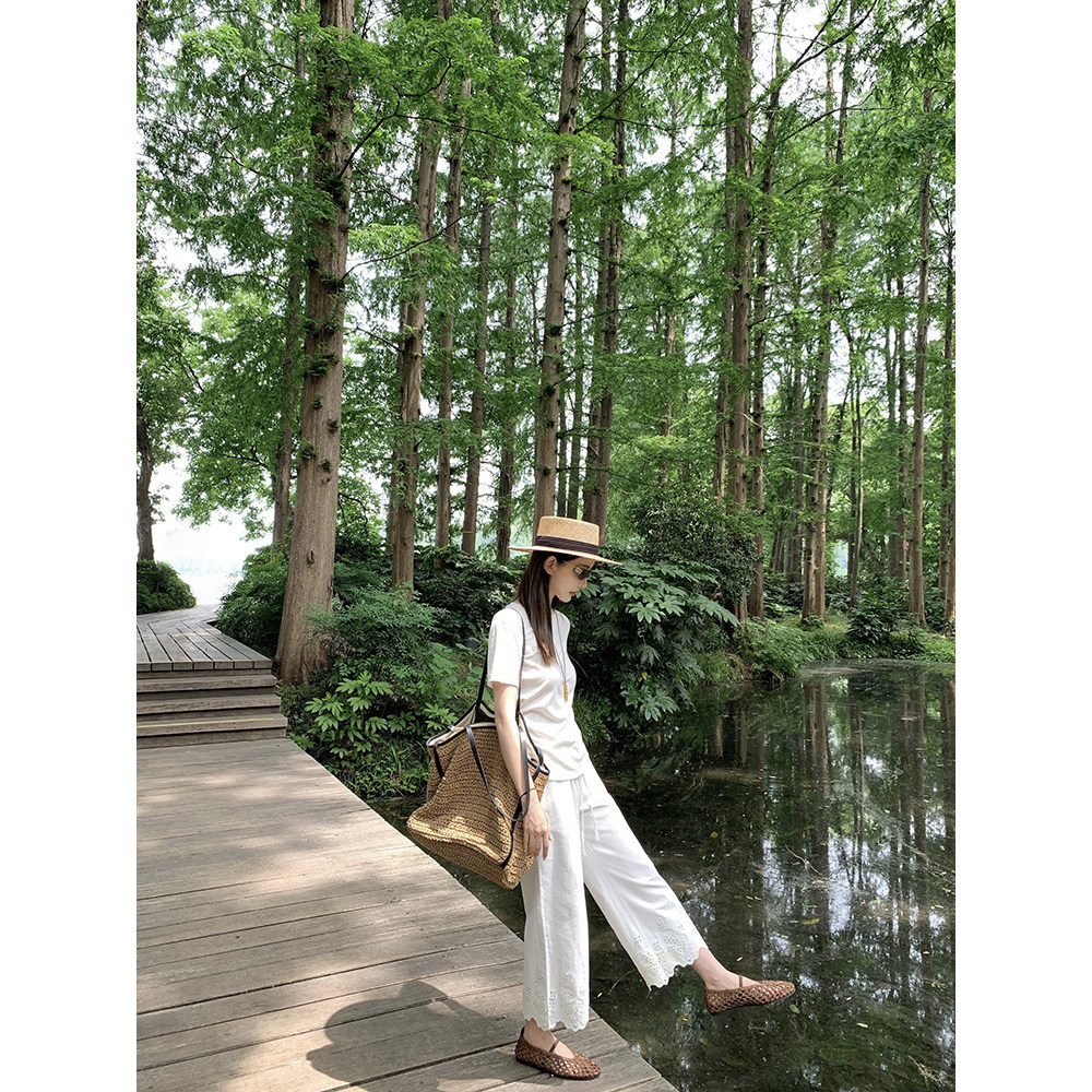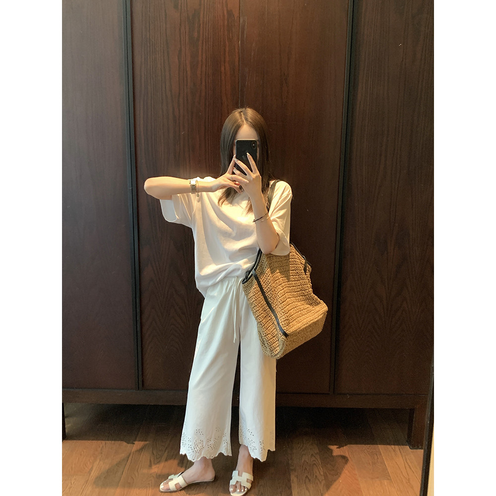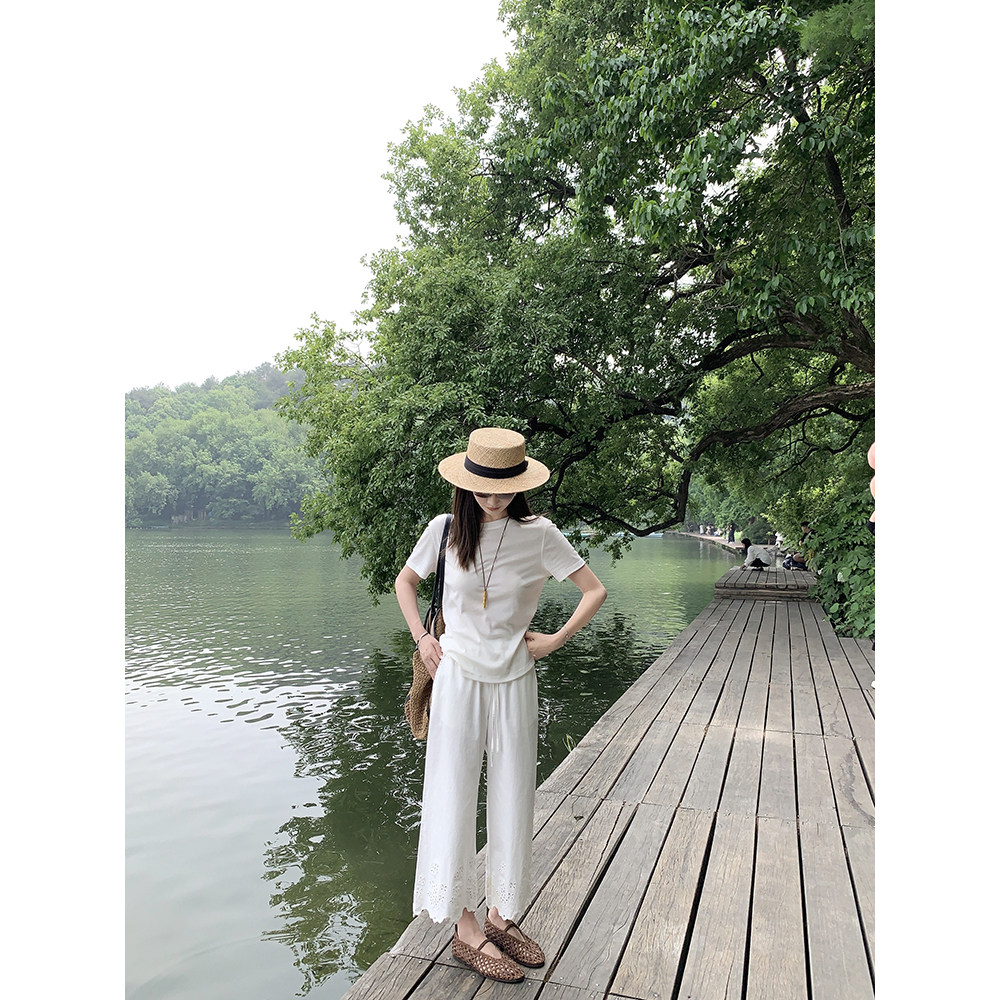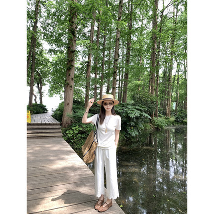 大小姐77 静奢重磅刺绣100棉夏日透气好搭显瘦9分白色休闲裤