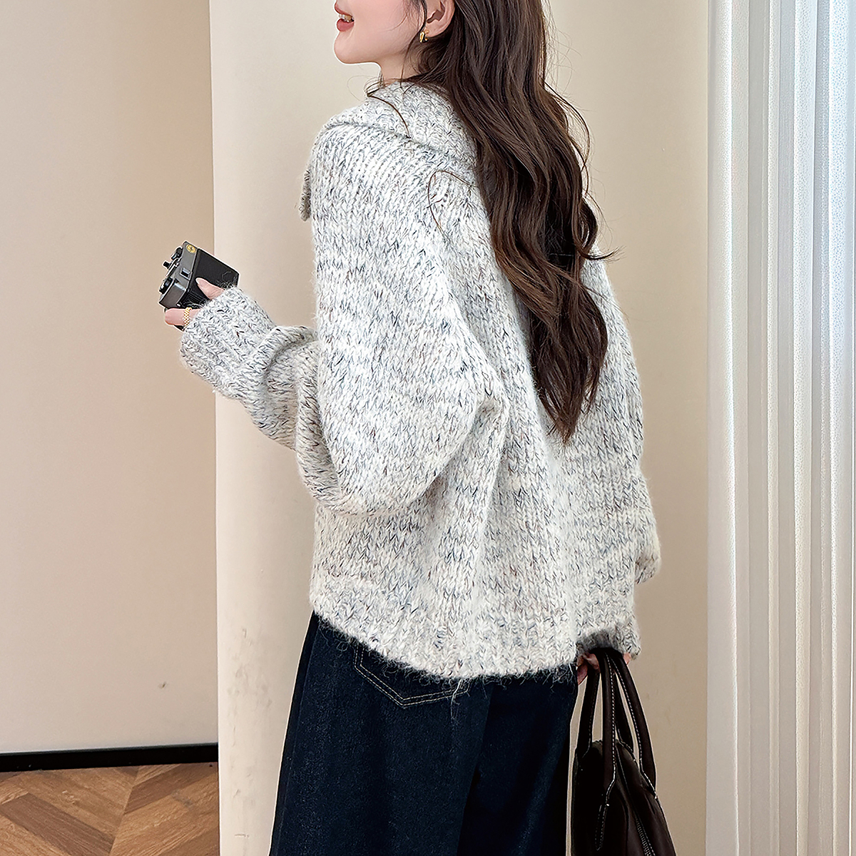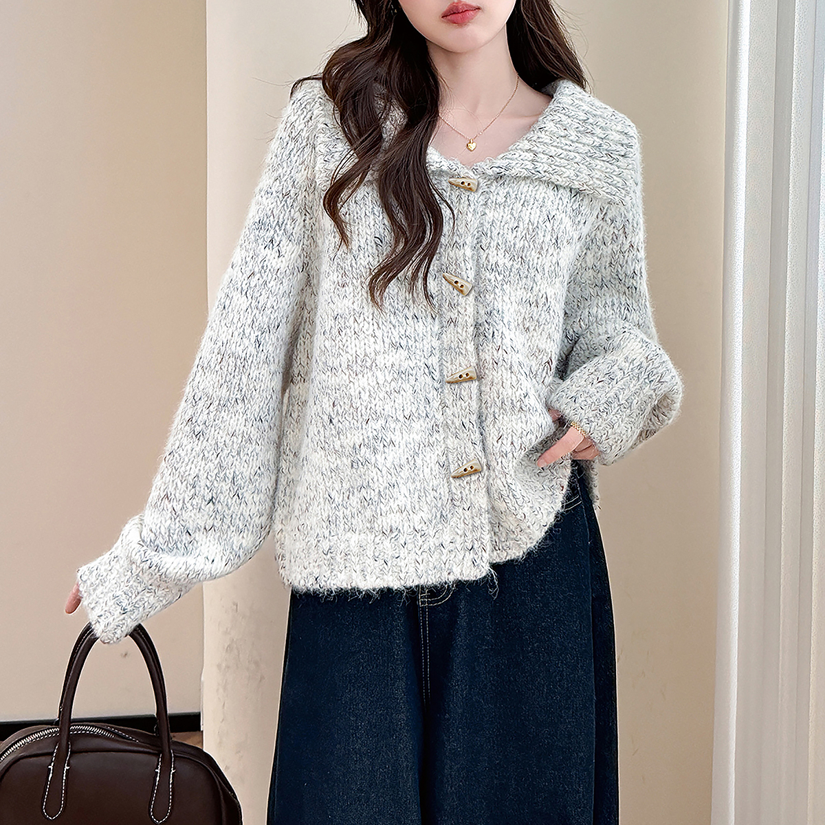 唐狮秋冬新型花纱设计翻领针织开衫女春秋外套高级感女式毛衣tu
