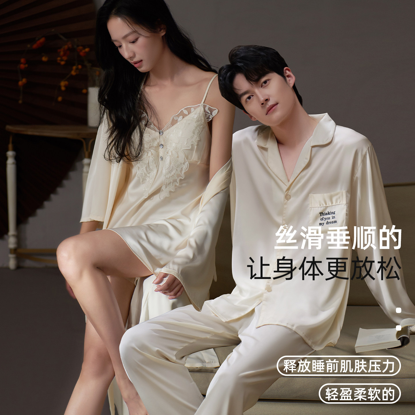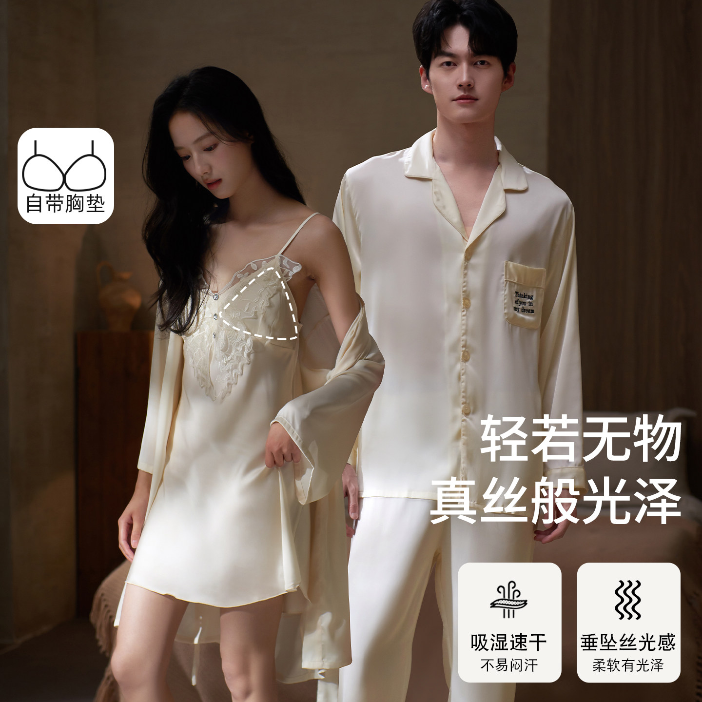 情侣睡衣春秋女冰丝纯欲性感带胸