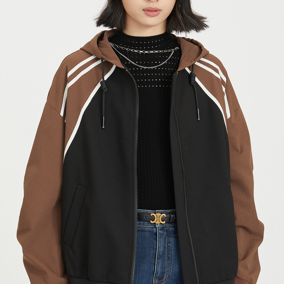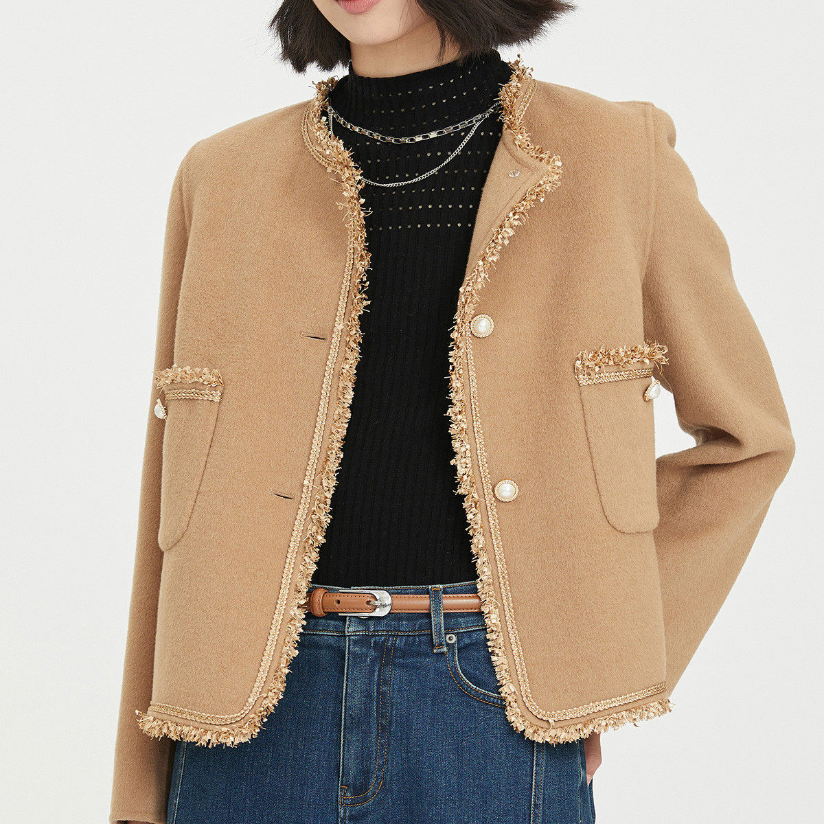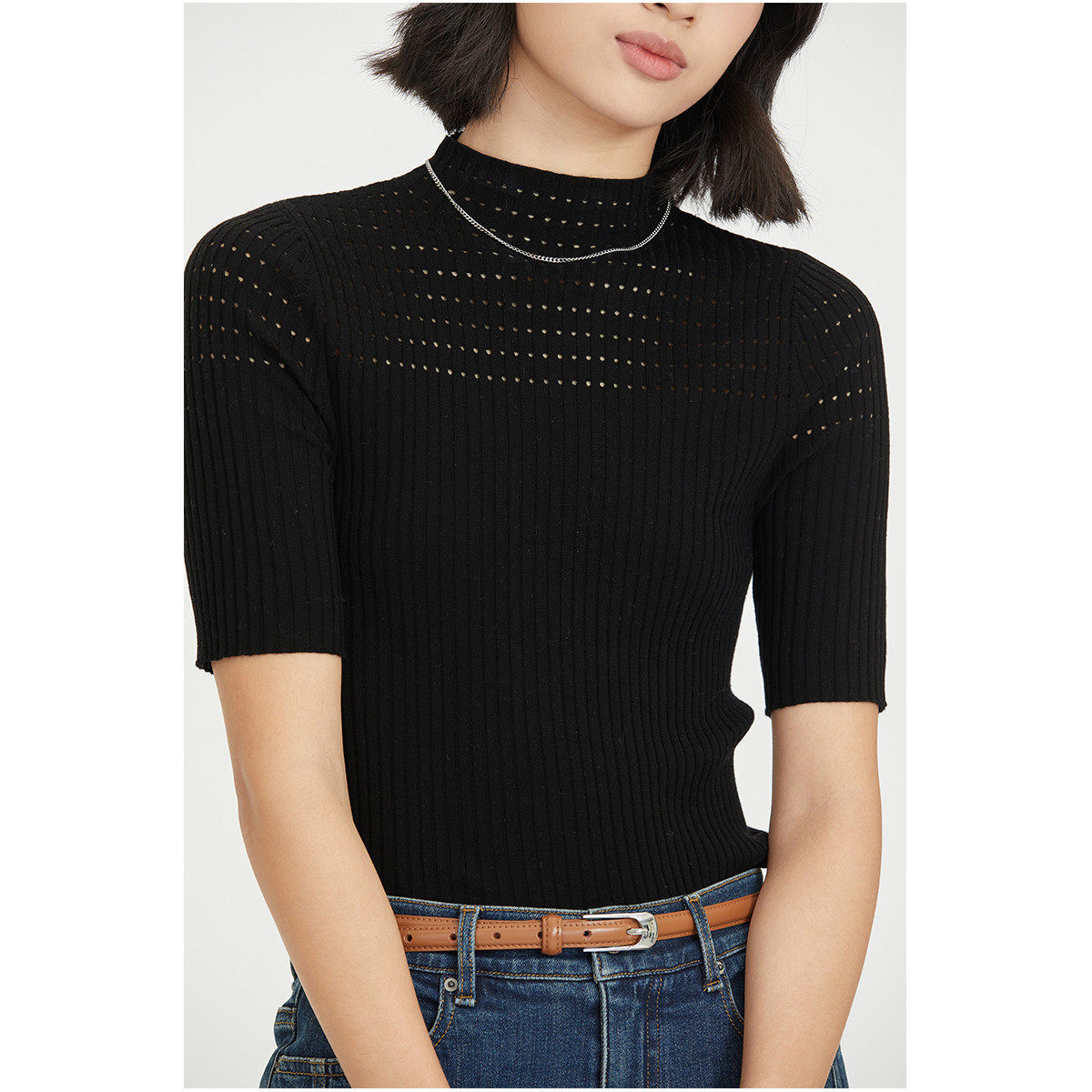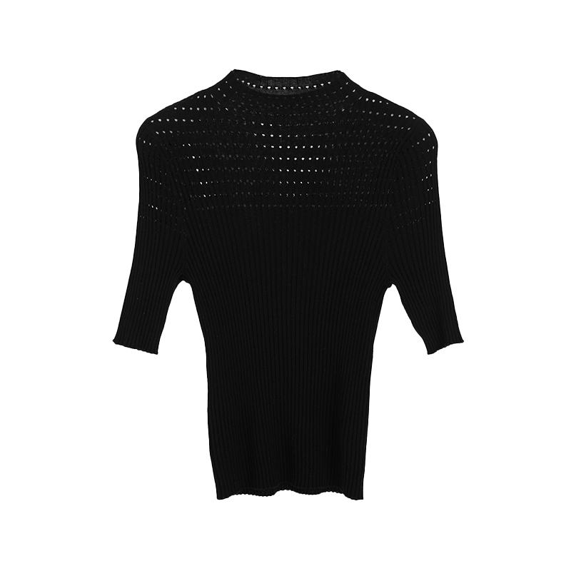 SANI商场同款100%绵羊毛半高领镂空设计感套头针织衫女中袖上衣