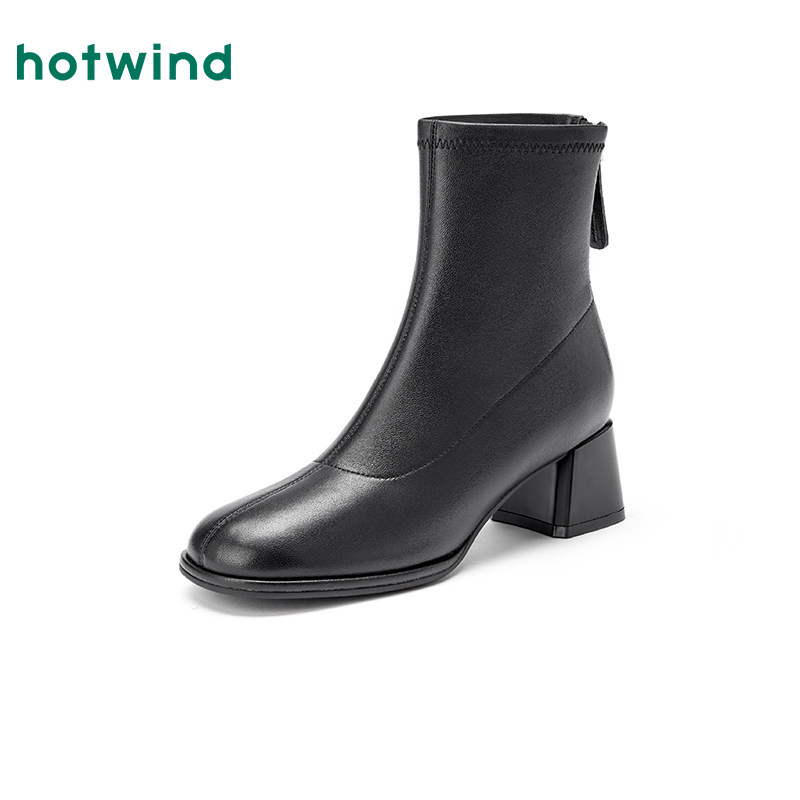 热风粗跟时装靴女2025年冬季新款黑色短筒女靴休闲百搭时髦短靴子