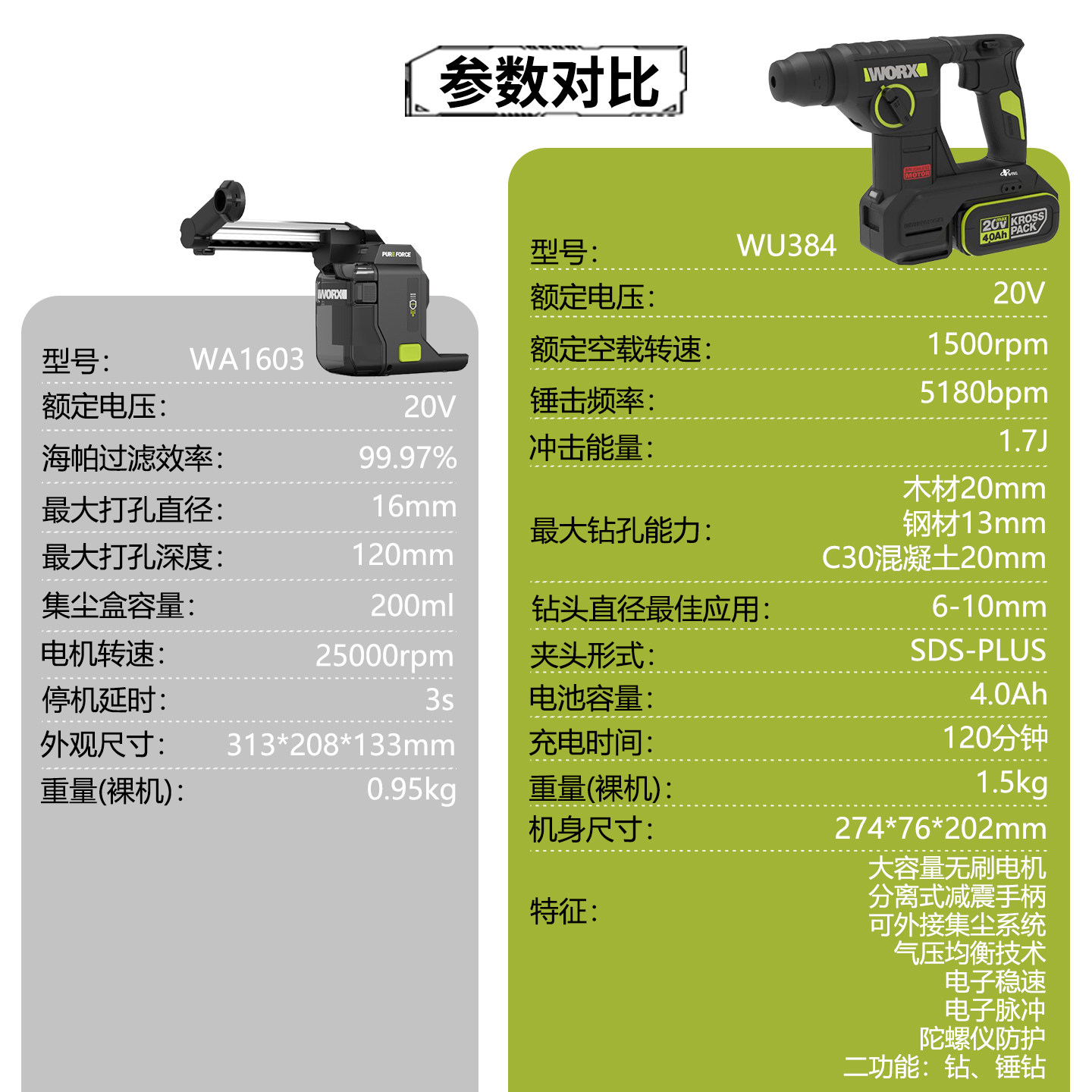 威克士新款WU384集尘电锤无刷锂电冲击钻工业级多功能轻型电钻
