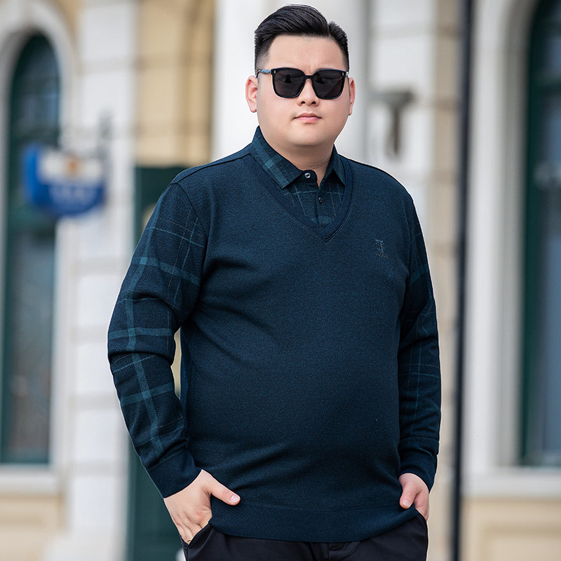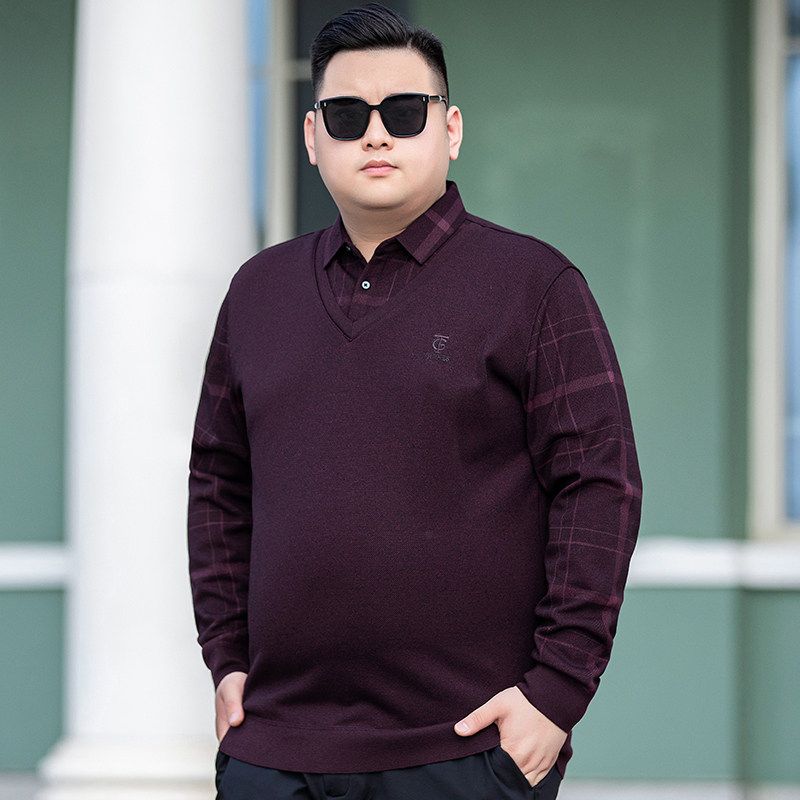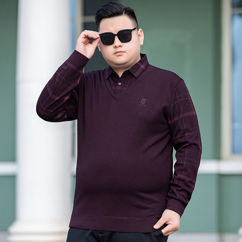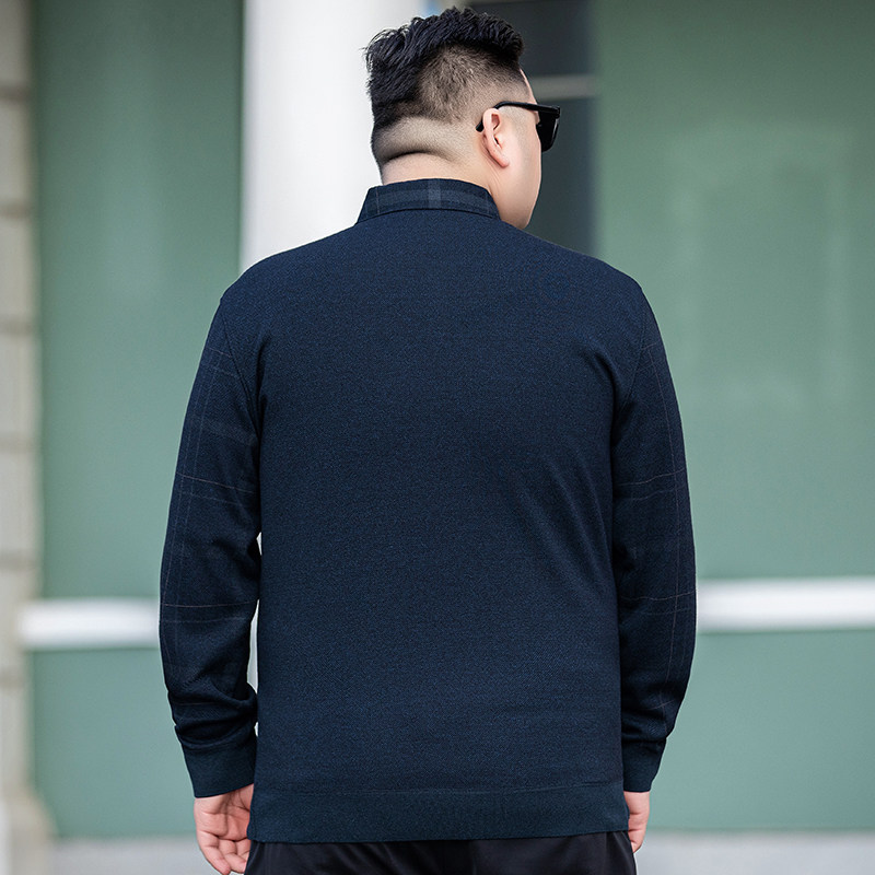 秋冬加厚保暖大码男士假二件长袖T恤加肥加大翻领加绒打底衫体恤