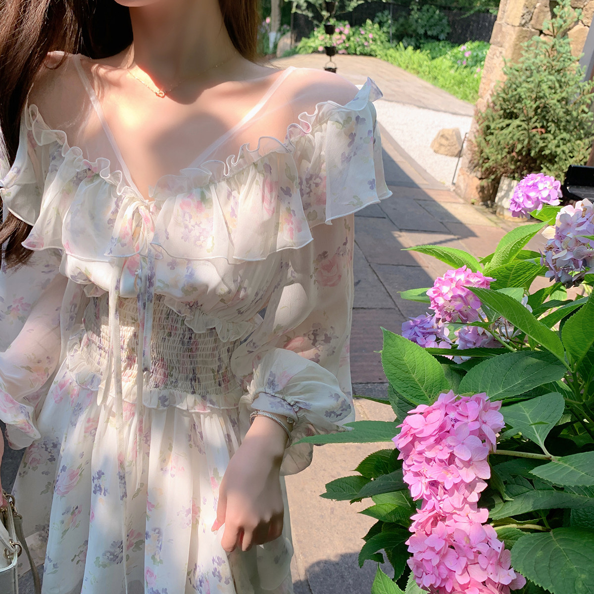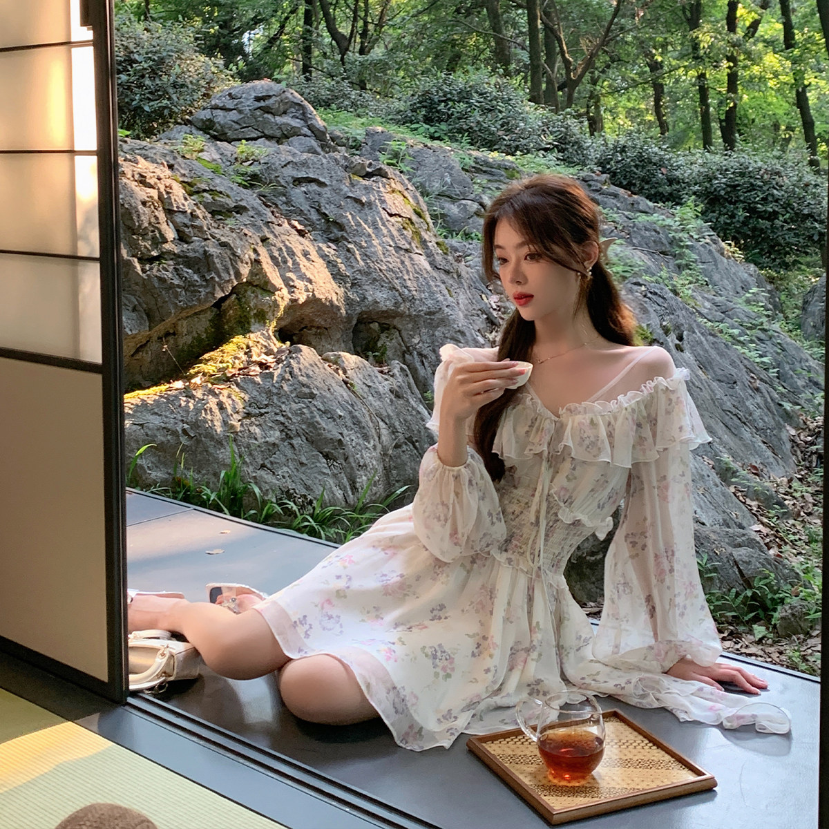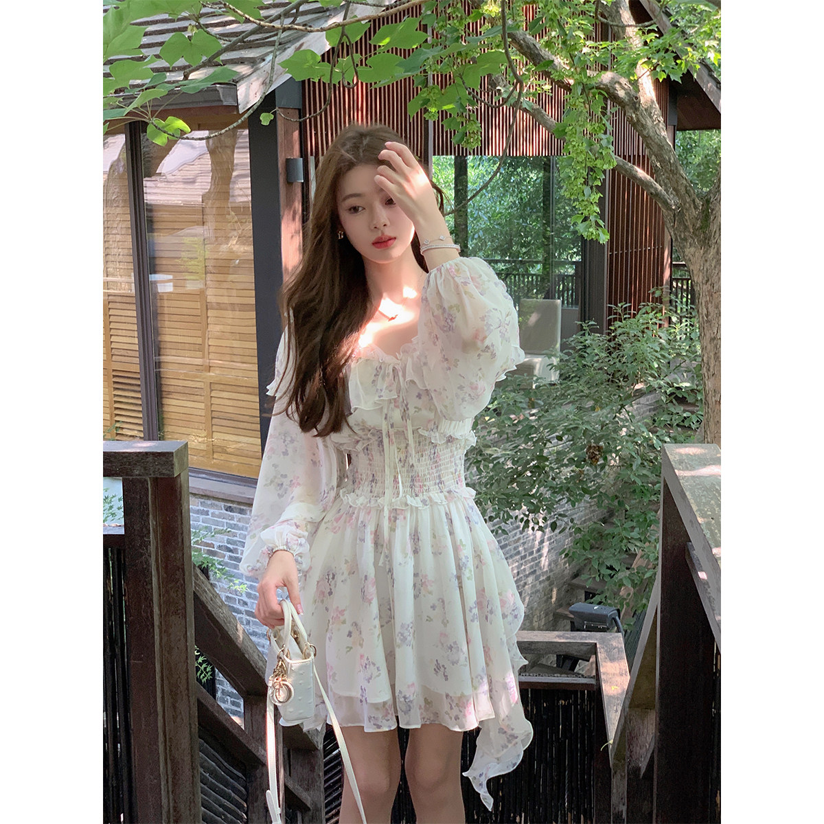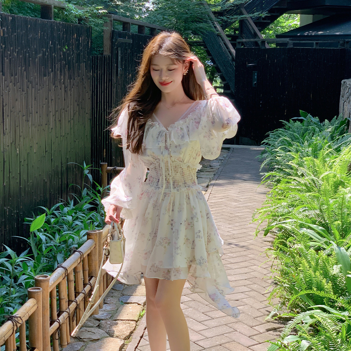ByYou 夏季新款泡泡袖v领雪纺粉紫碎花连衣裙短款收腰温柔仙女裙