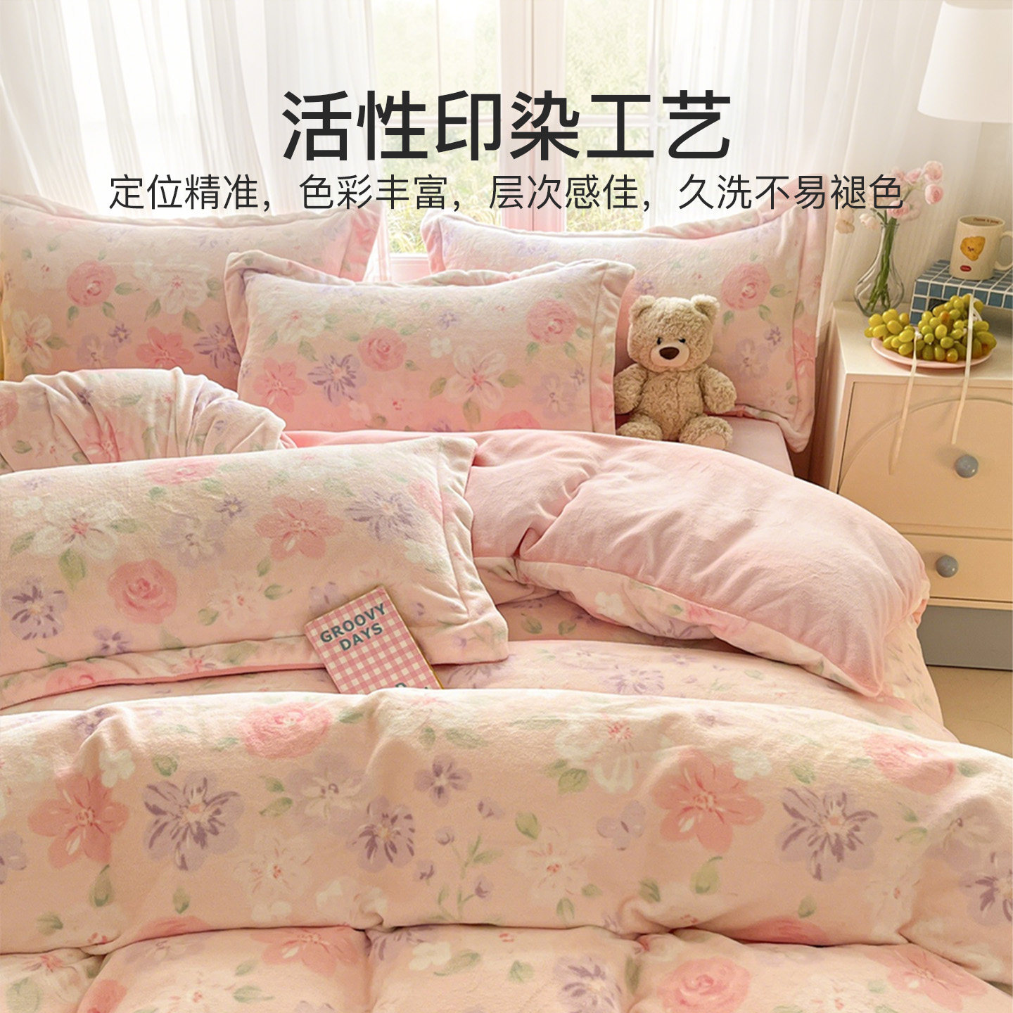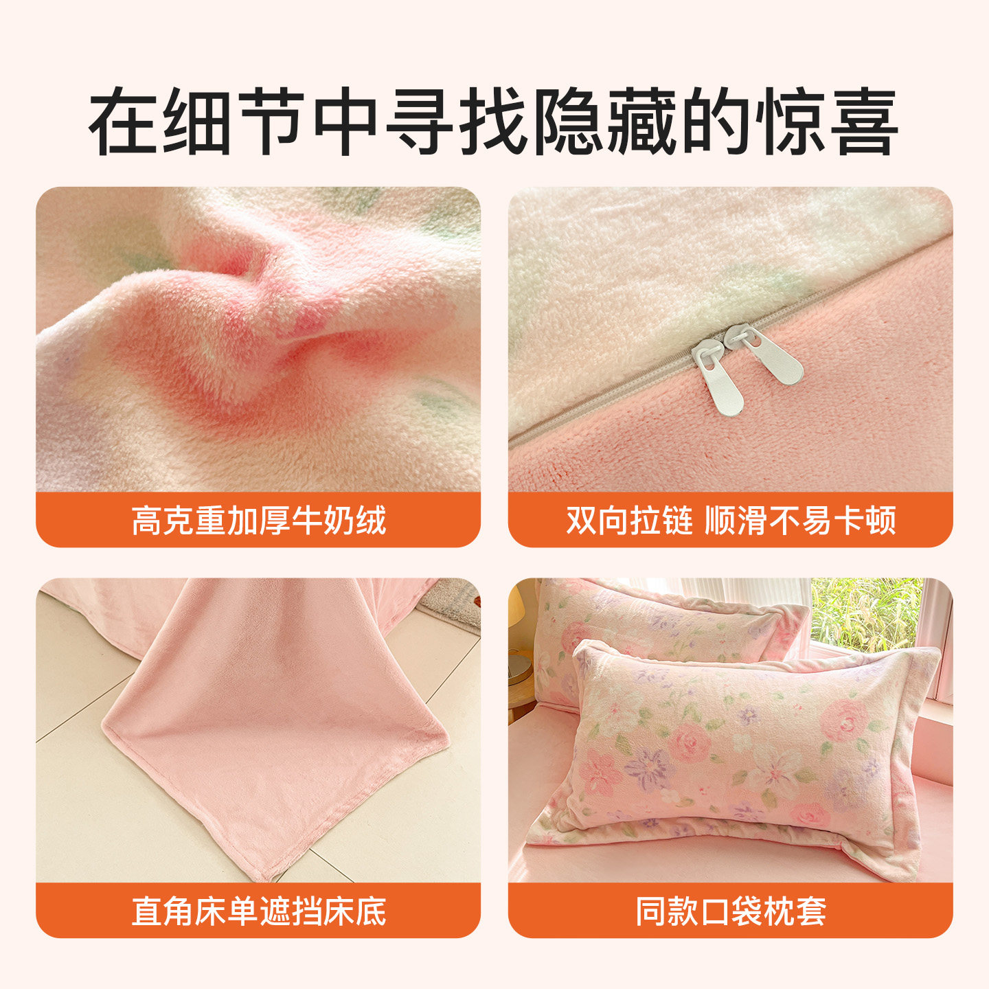 洁丽雅牛奶绒四件套冬季珊瑚绒床品被套床单加绒法兰绒床上三件套