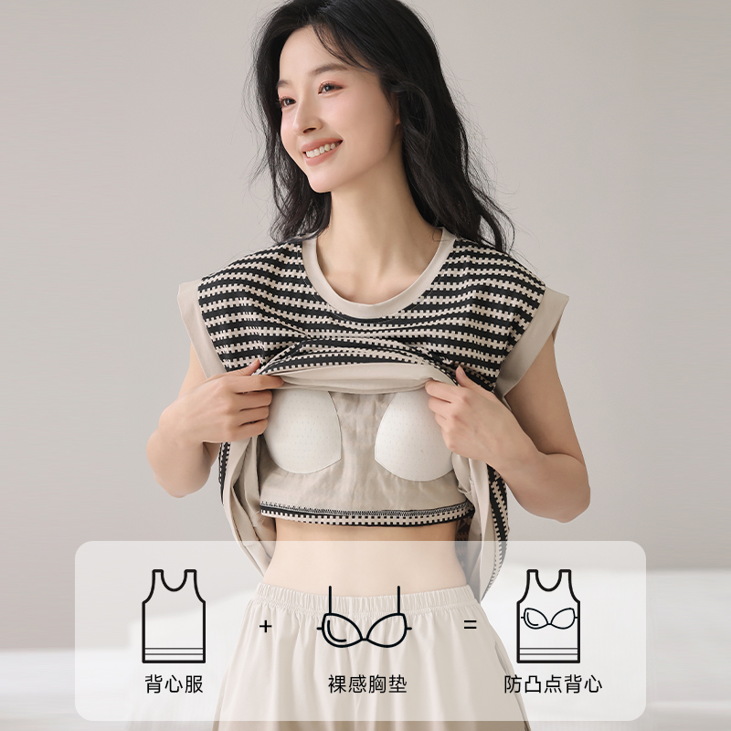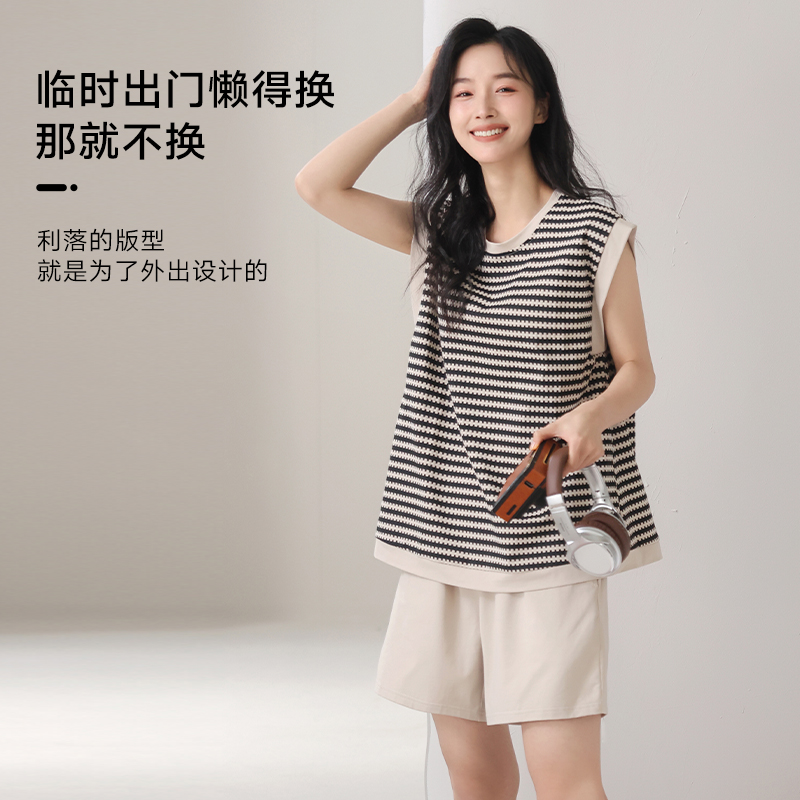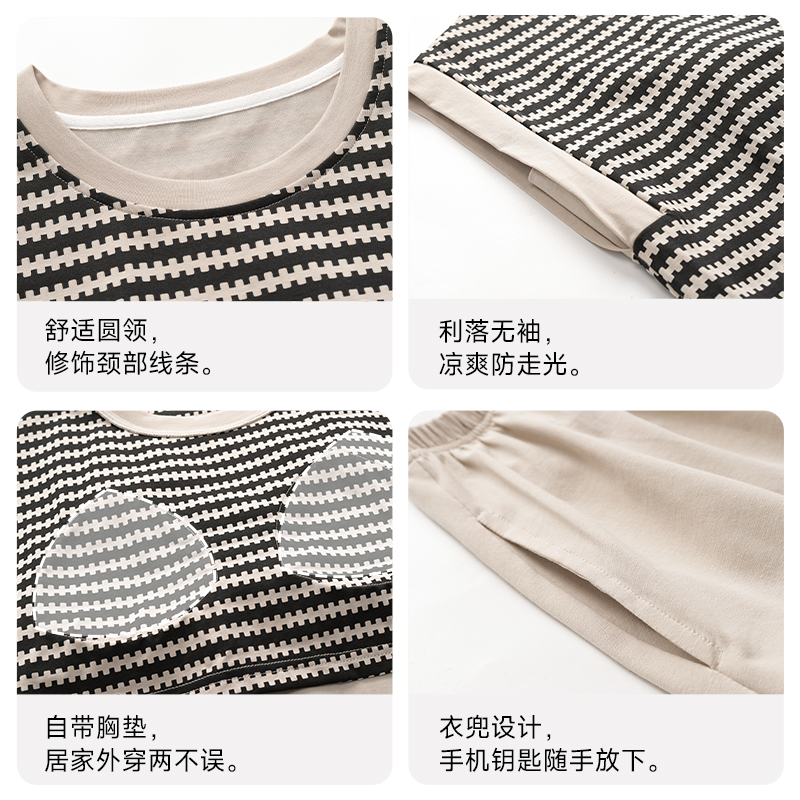 猫人纯棉睡衣女带胸垫夏季无袖背心短裤套装高级可外穿条纹家居服