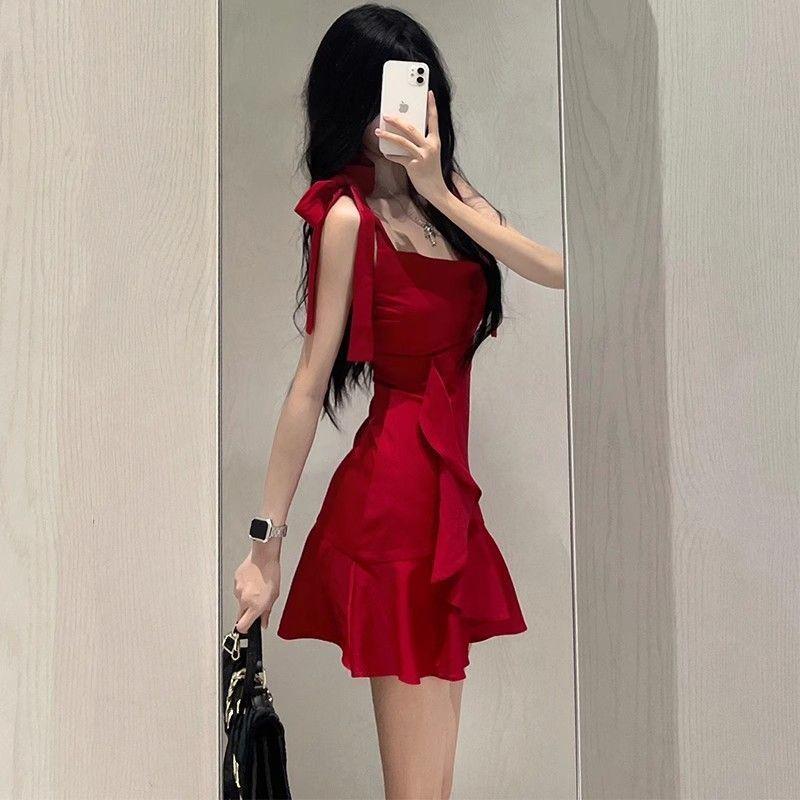 新款荷叶气质辣妹红色吊带连衣裙小个子夏季纯欲风收腰显瘦短裙女