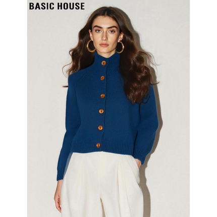 Basic House/百家好蓝色高领毛衣外套女2026春季新款短款针织开衫