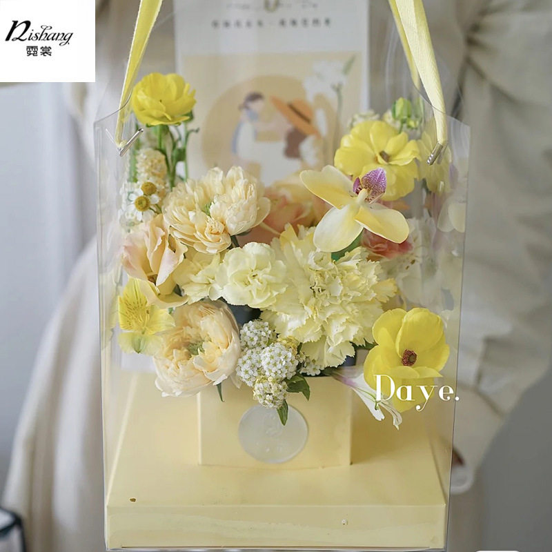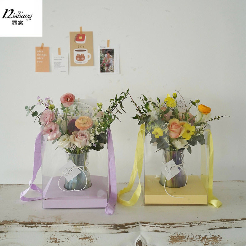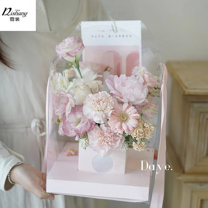 三八节方形PVC透明手提花盒鲜花包装折叠纸盒520花艺插花盒礼品盒