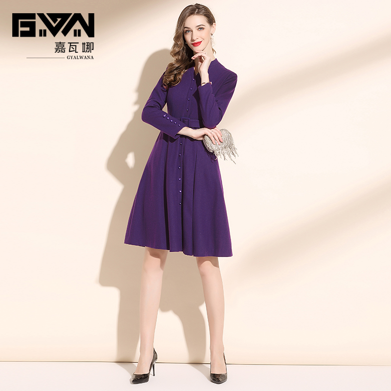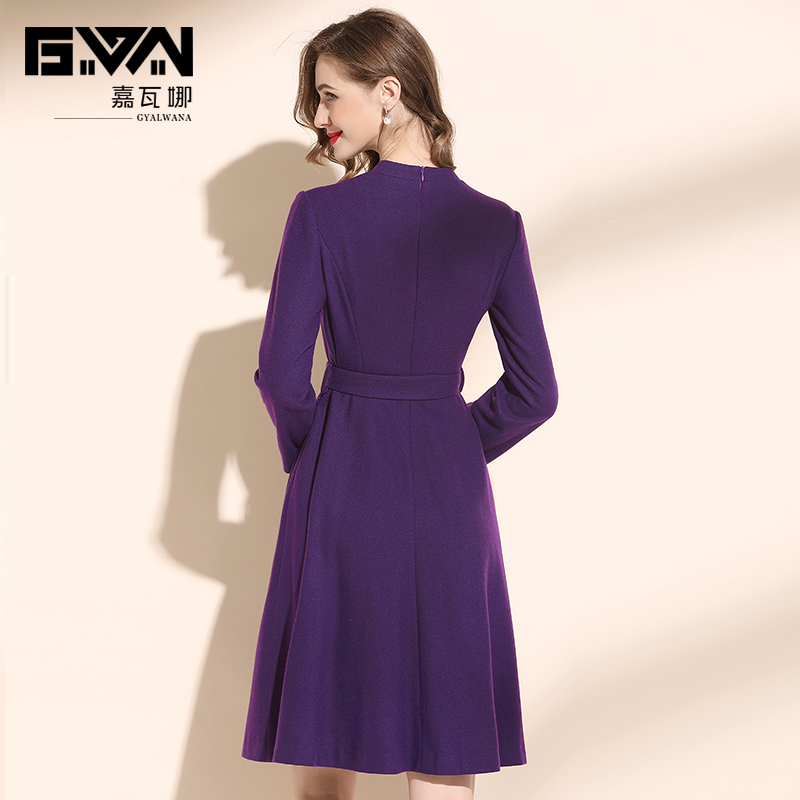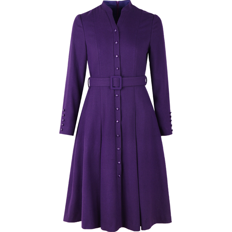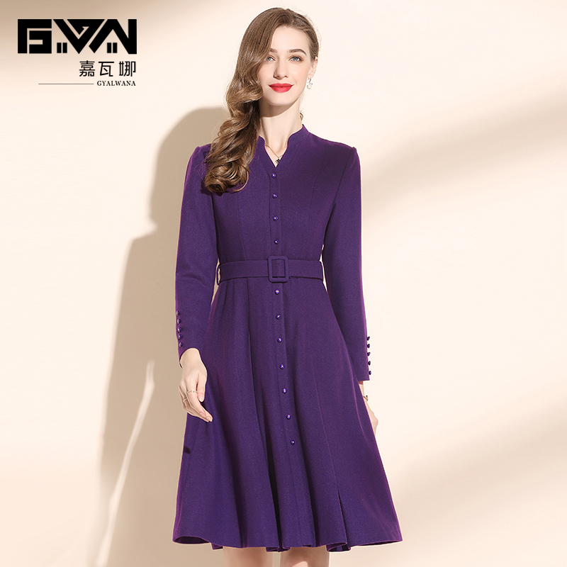 冬装2025年新款女系带收腰高端气质v领紫色毛呢连衣裙秋冬中长款