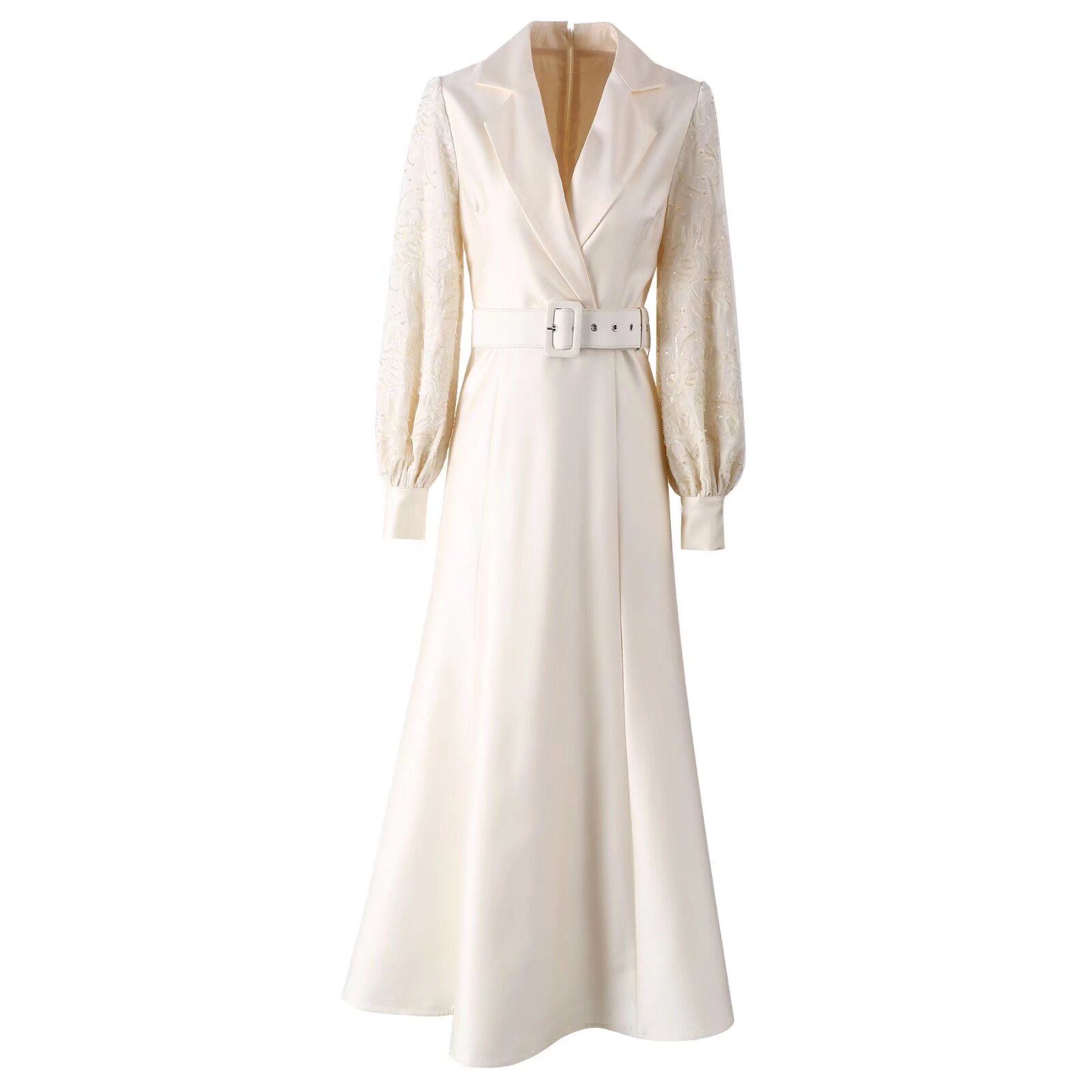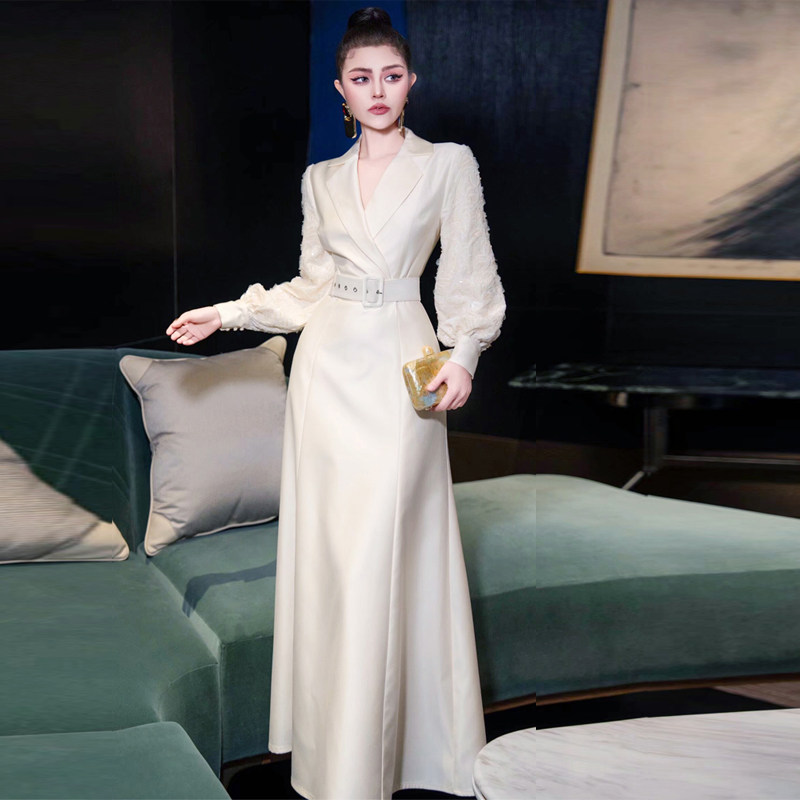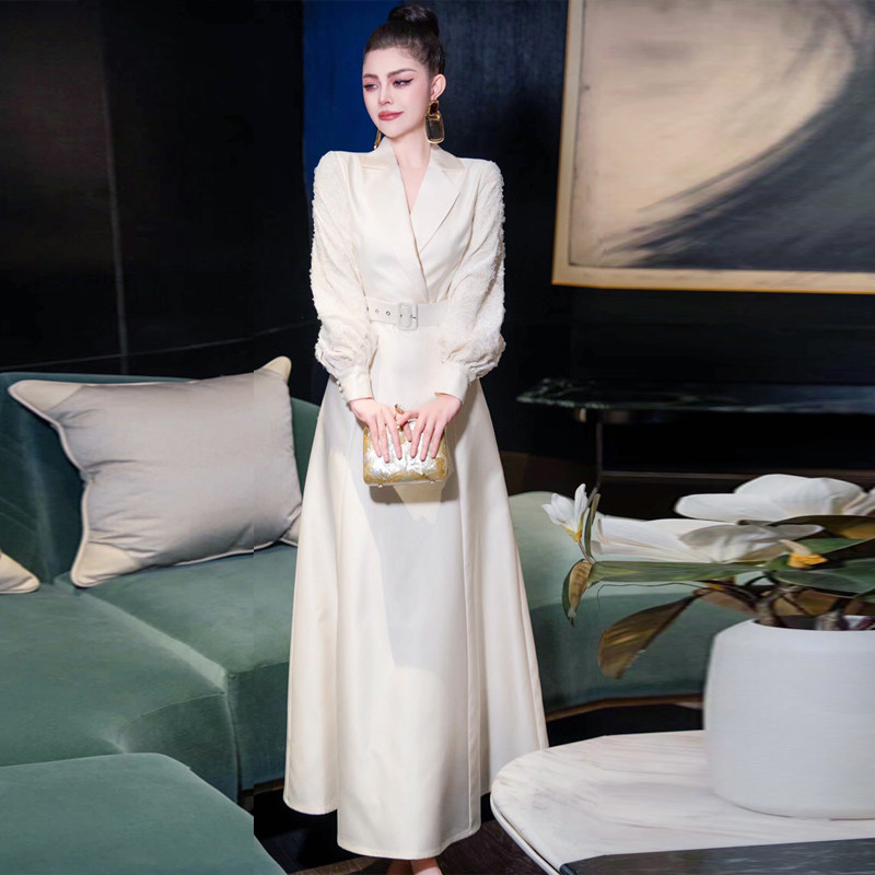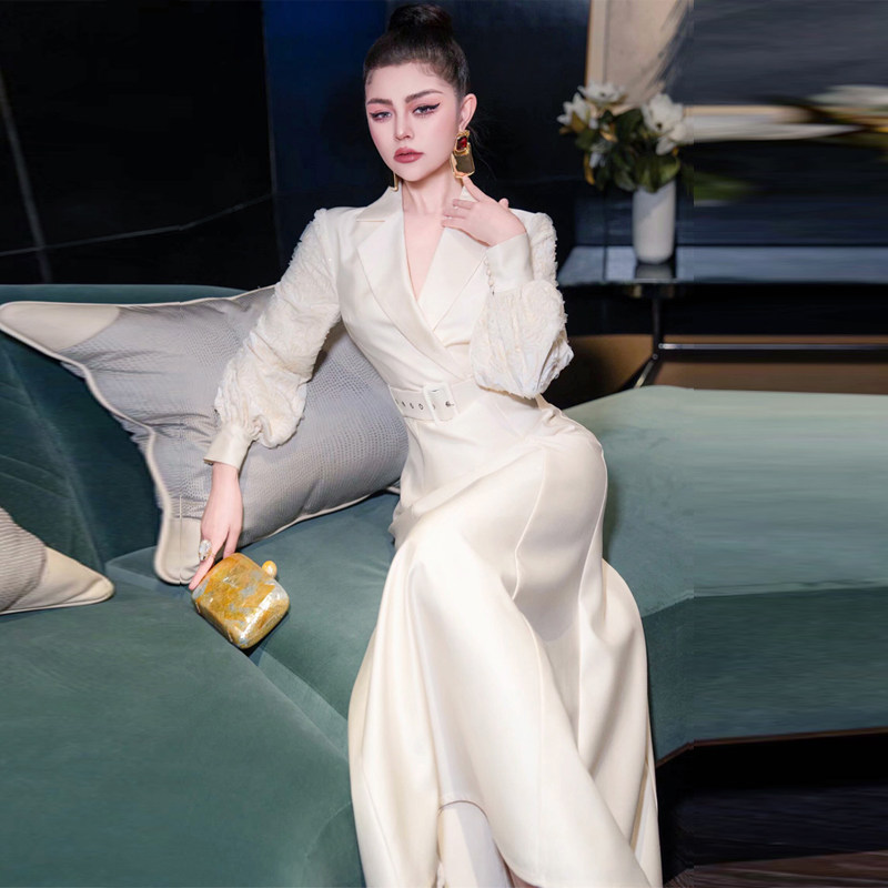 欧货女装2026春秋走秀新款高级感法式长裙收腰气质白色西装连衣裙