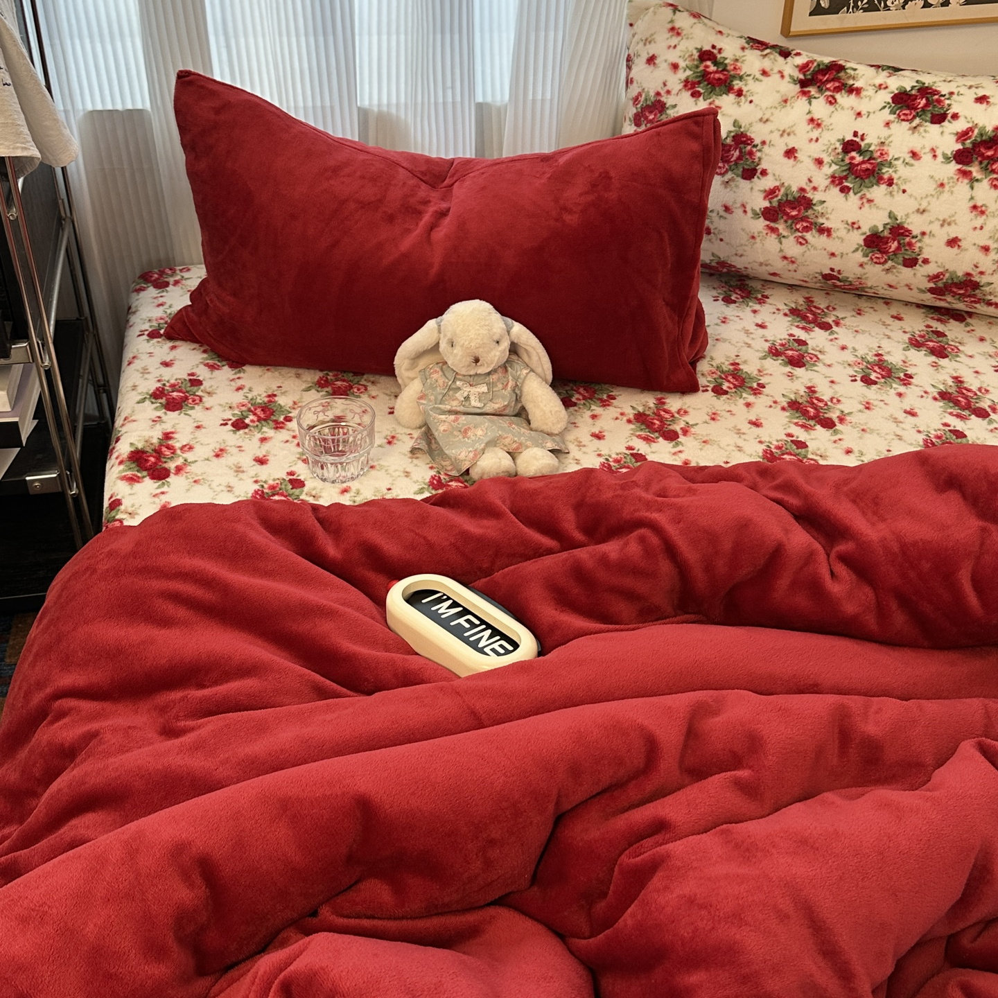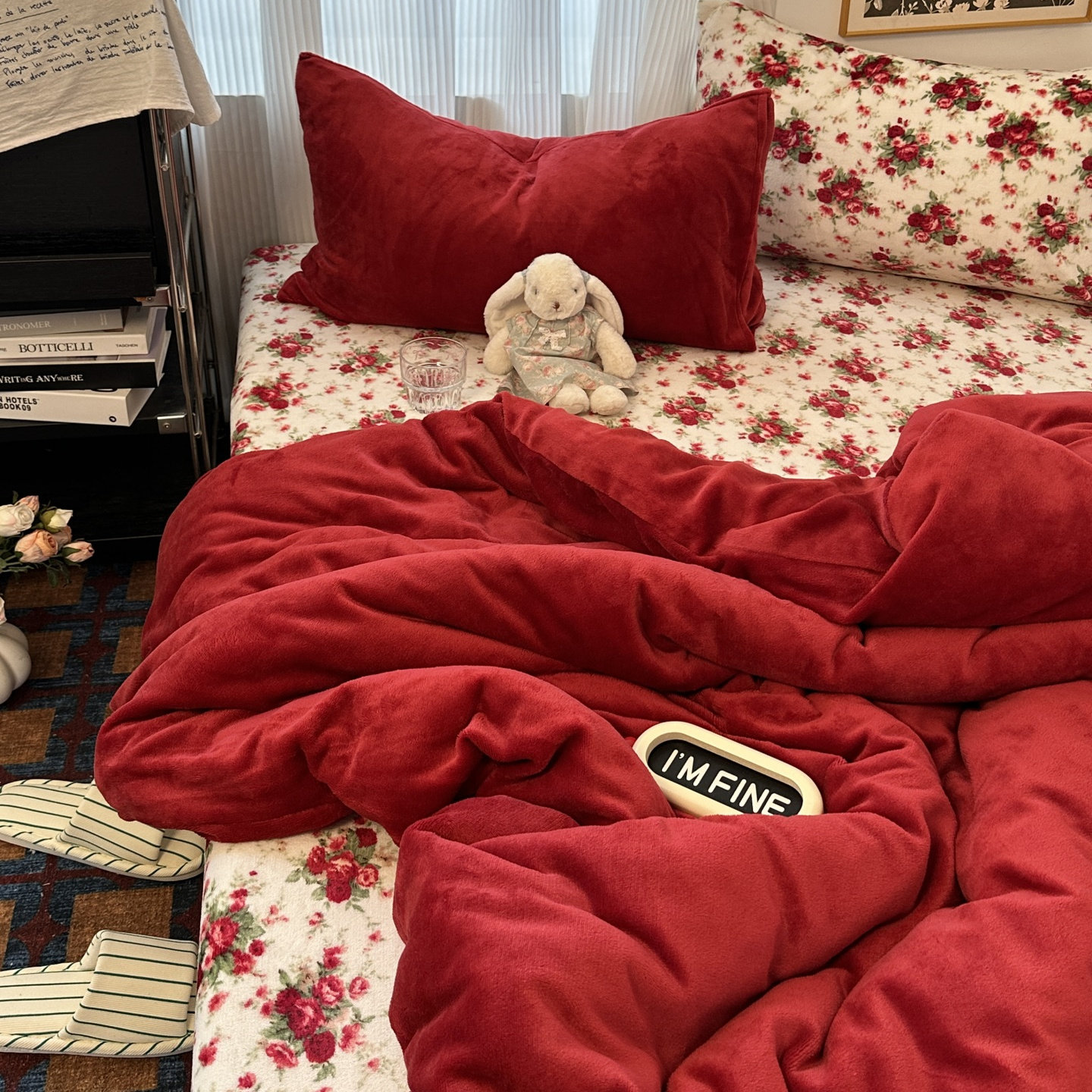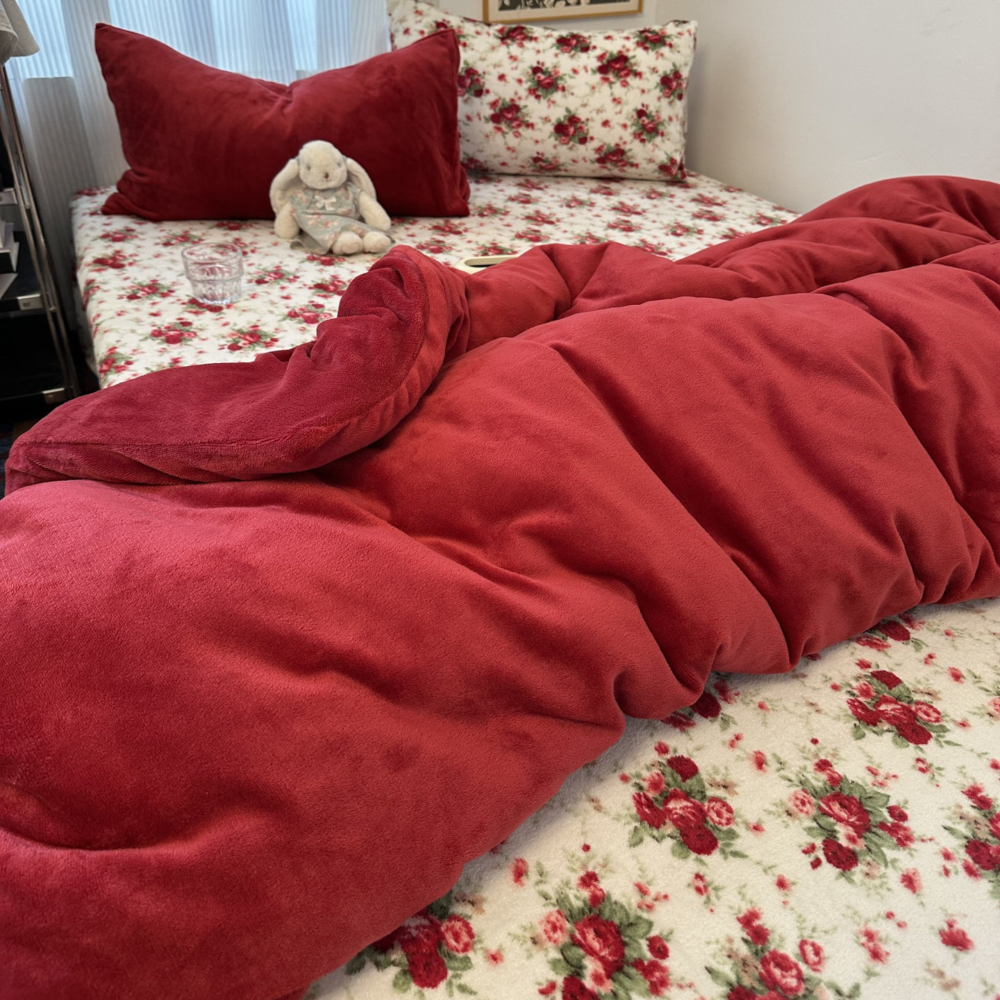 韩国设计少女番茄红小碎花加厚牛奶绒四件套冬天珊瑚绒四件套床笠