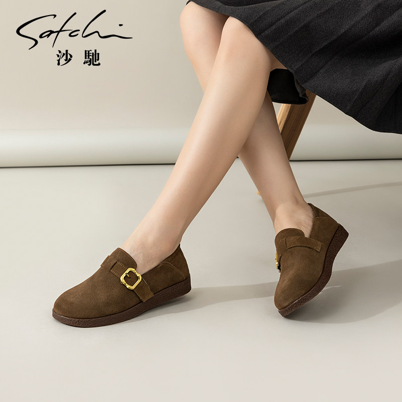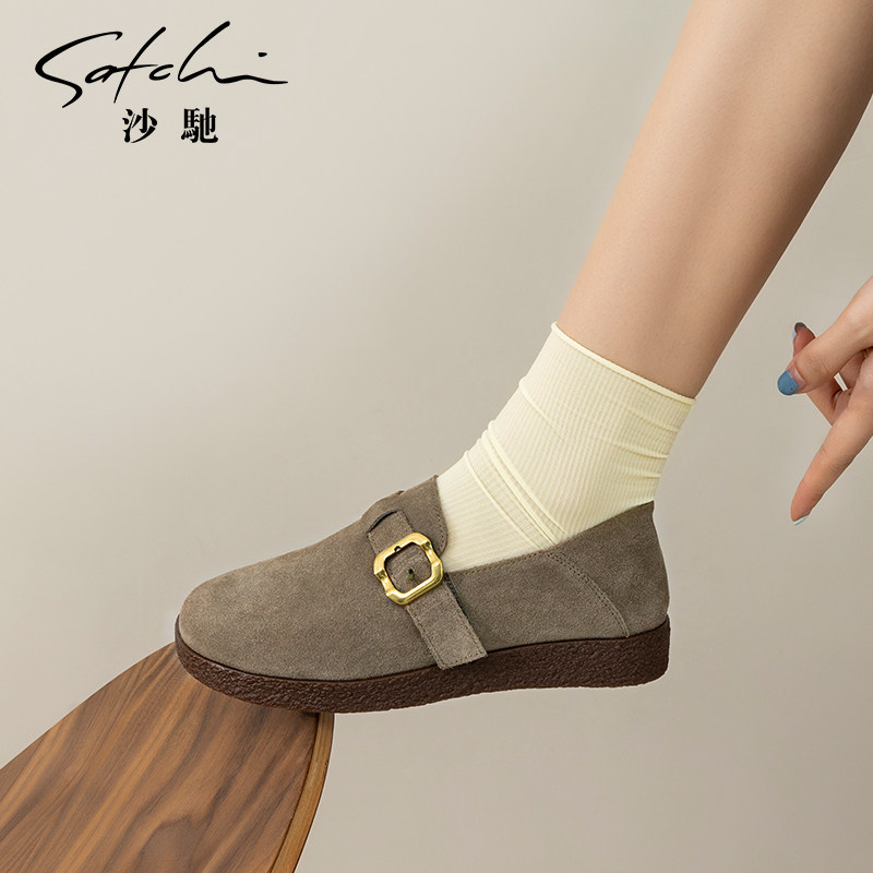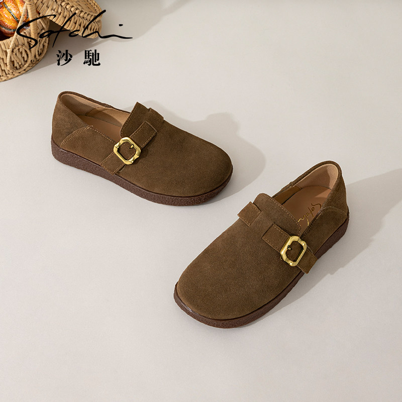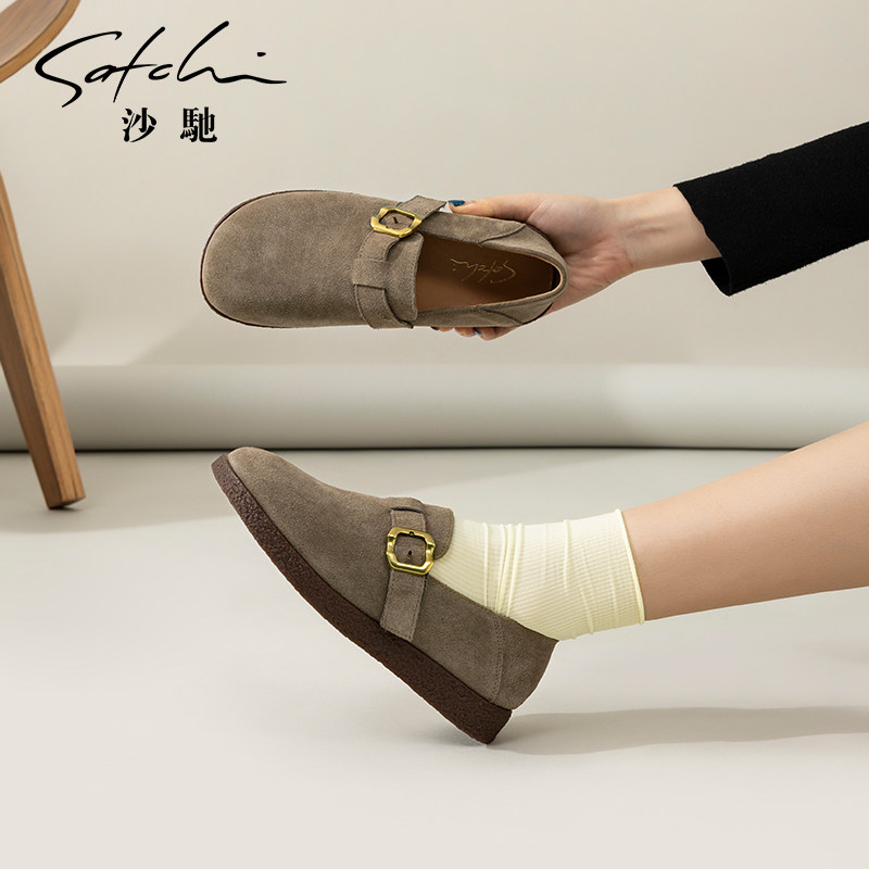 沙驰女鞋复古皮带扣勃肯鞋2025年秋冬新款一脚蹬平底鞋圆头休闲鞋