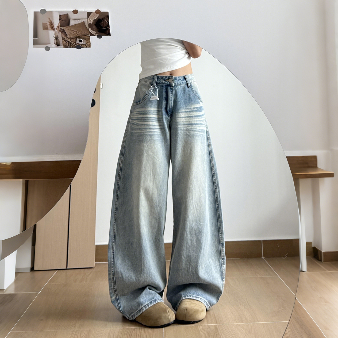 300斤胖mm大码美式复古水洗做旧弯刀牛仔裤女宽松直筒阔腿拖地裤