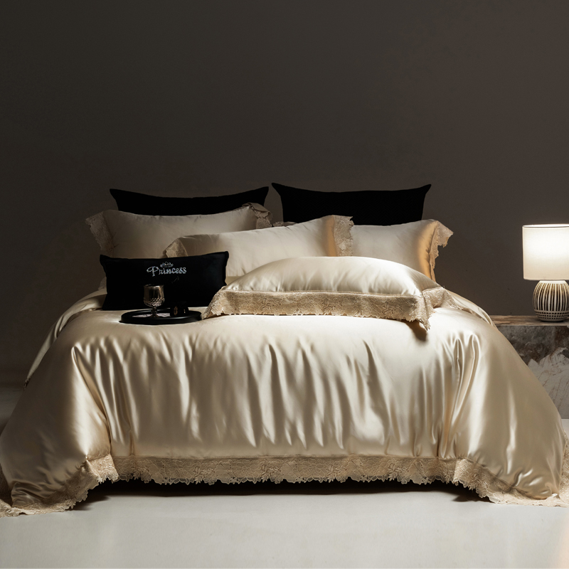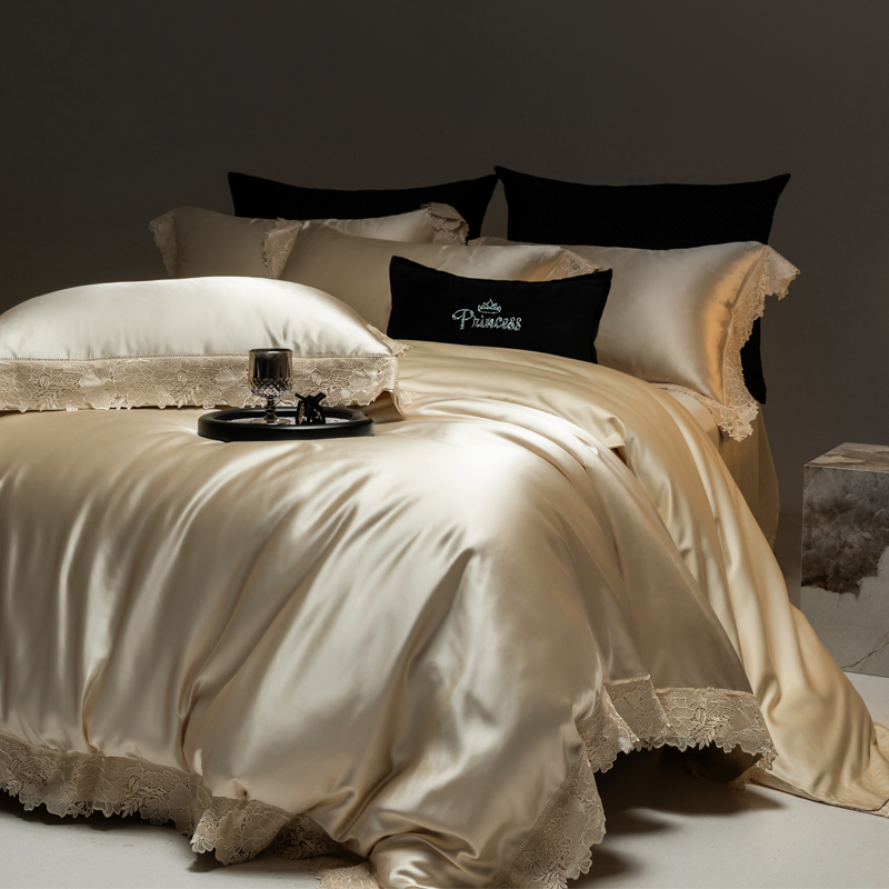 法式真丝棉蕾丝四件套香槟黄锦缎光泽被套天丝棉轻奢风床上用品