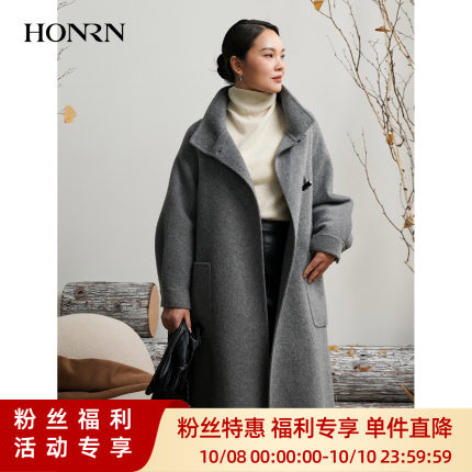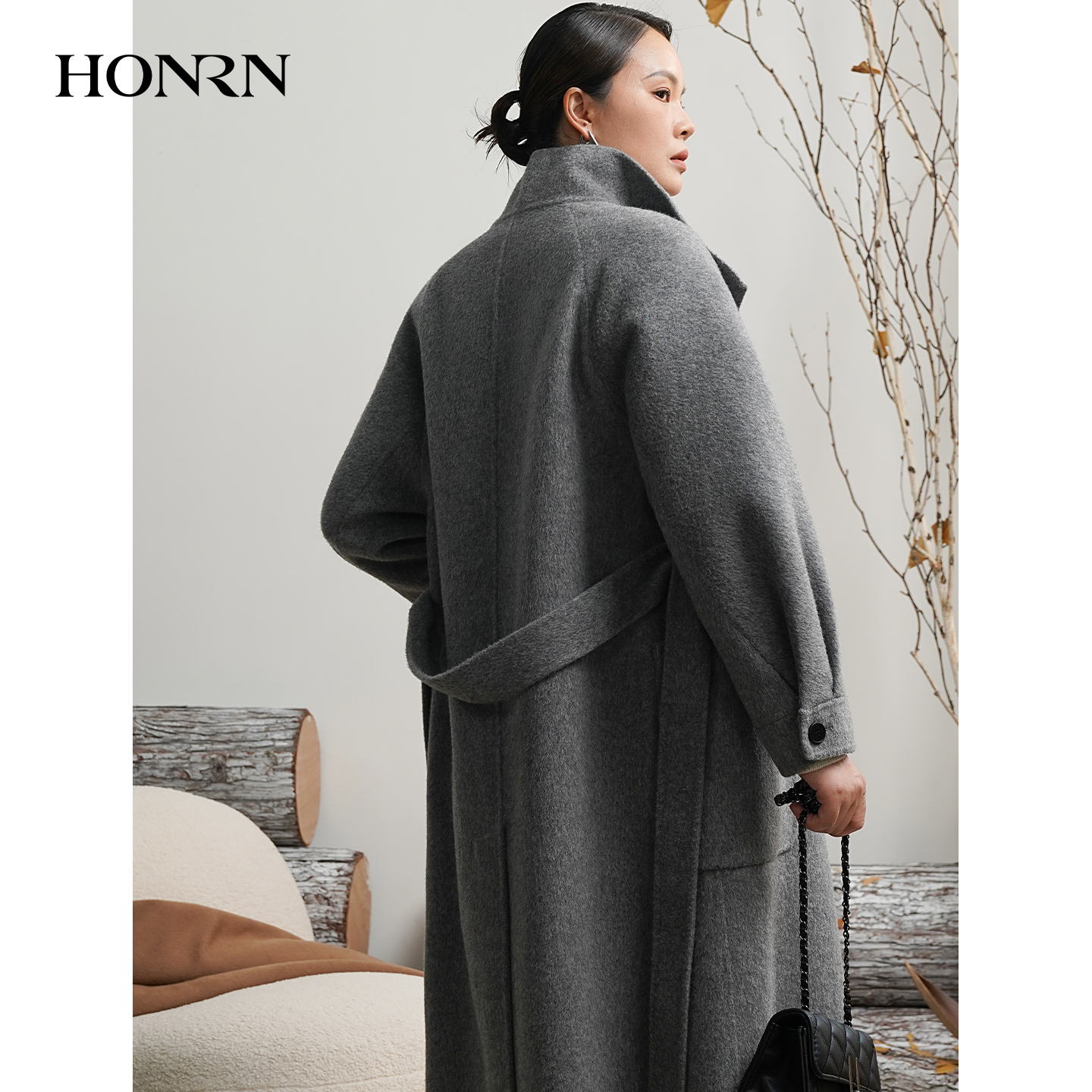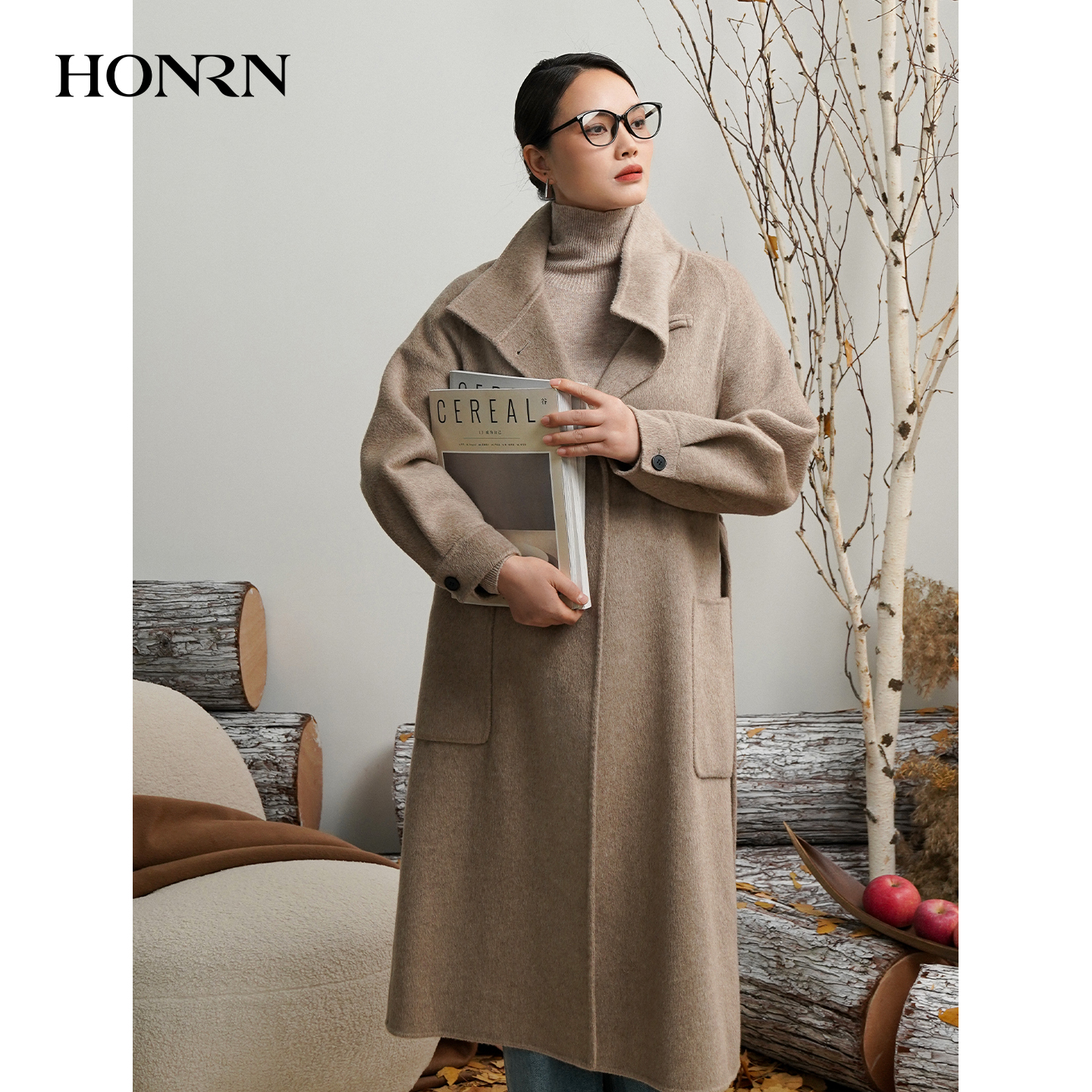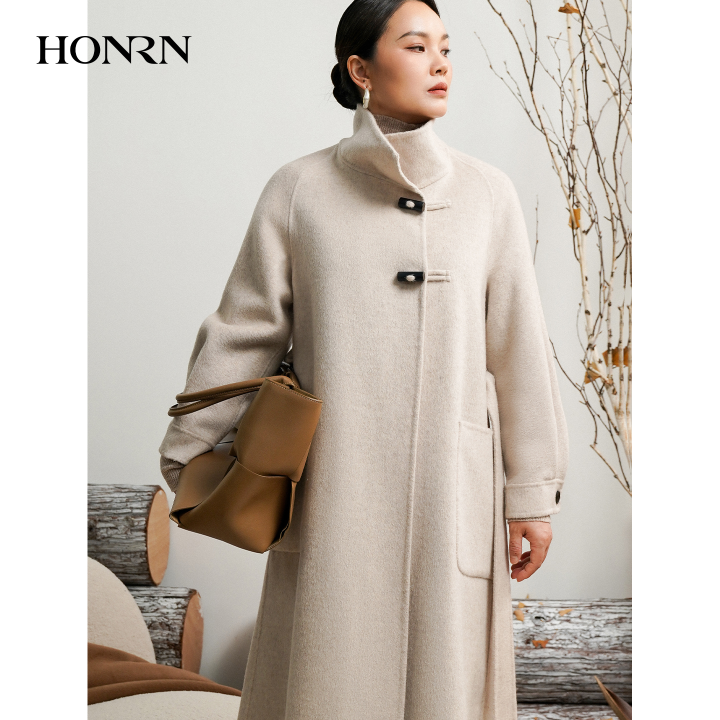 HONRN/红人立领系带收腰双面羊毛呢子大衣外套女秋冬季HK59OD010