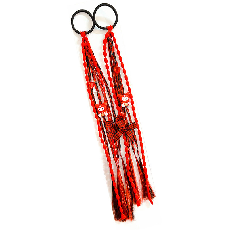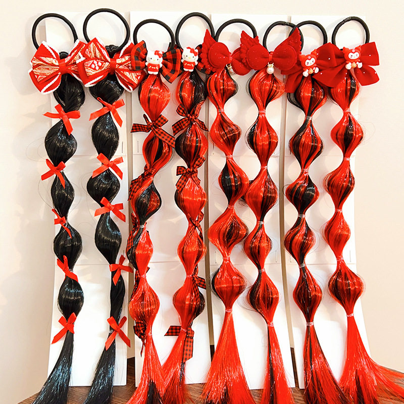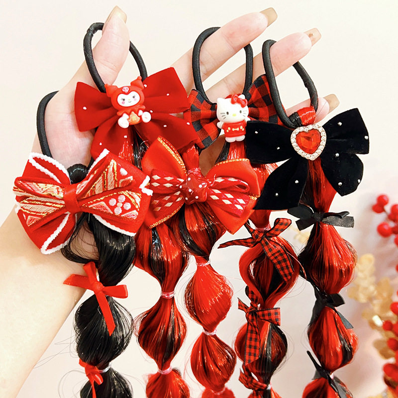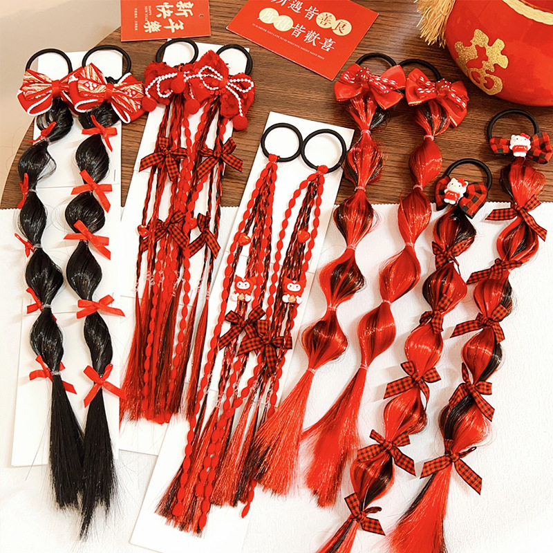 儿童新年红色假发辫子头饰甜美蝴蝶结发圈泡泡辫小女孩麻花辫发饰