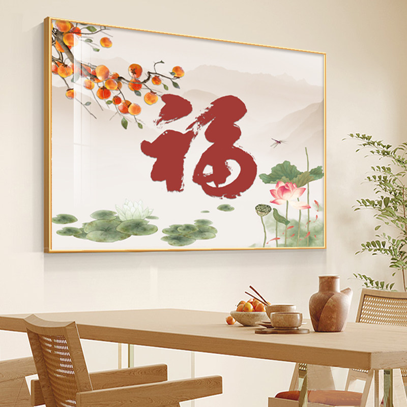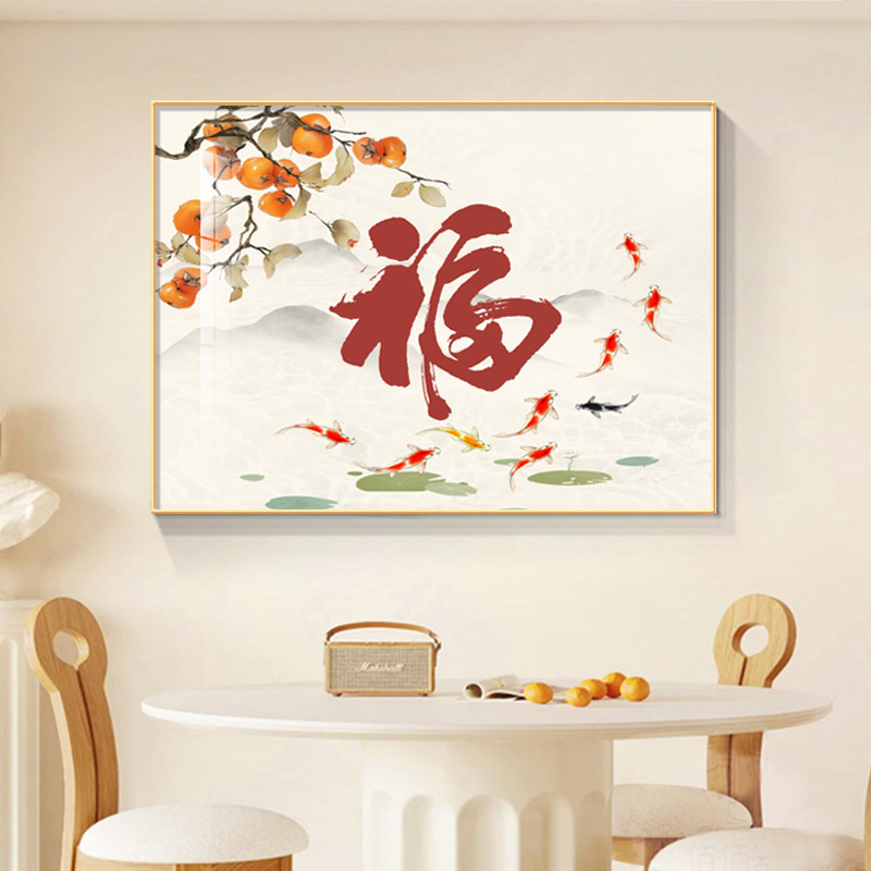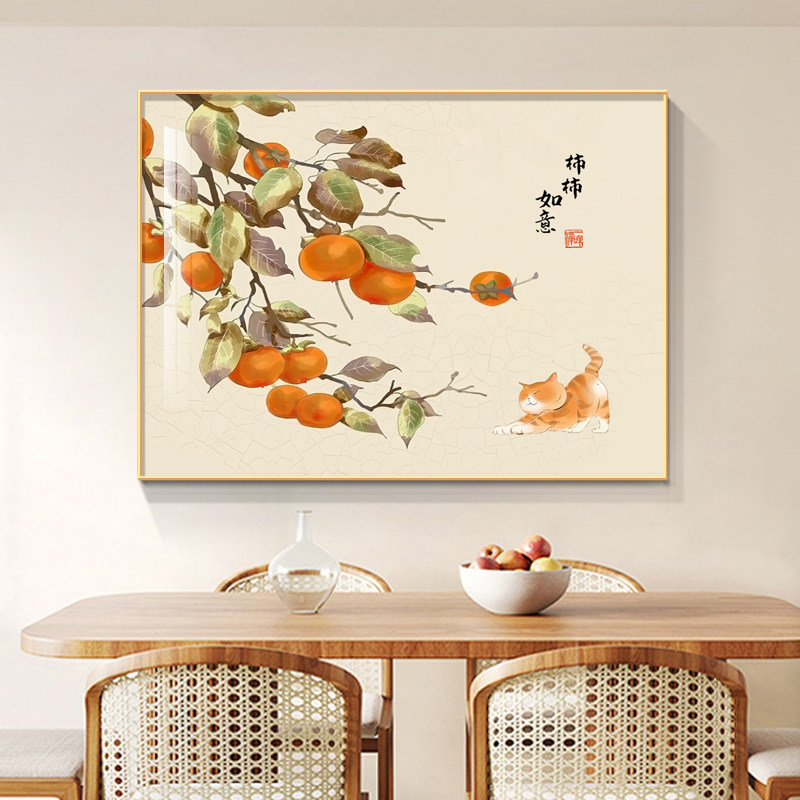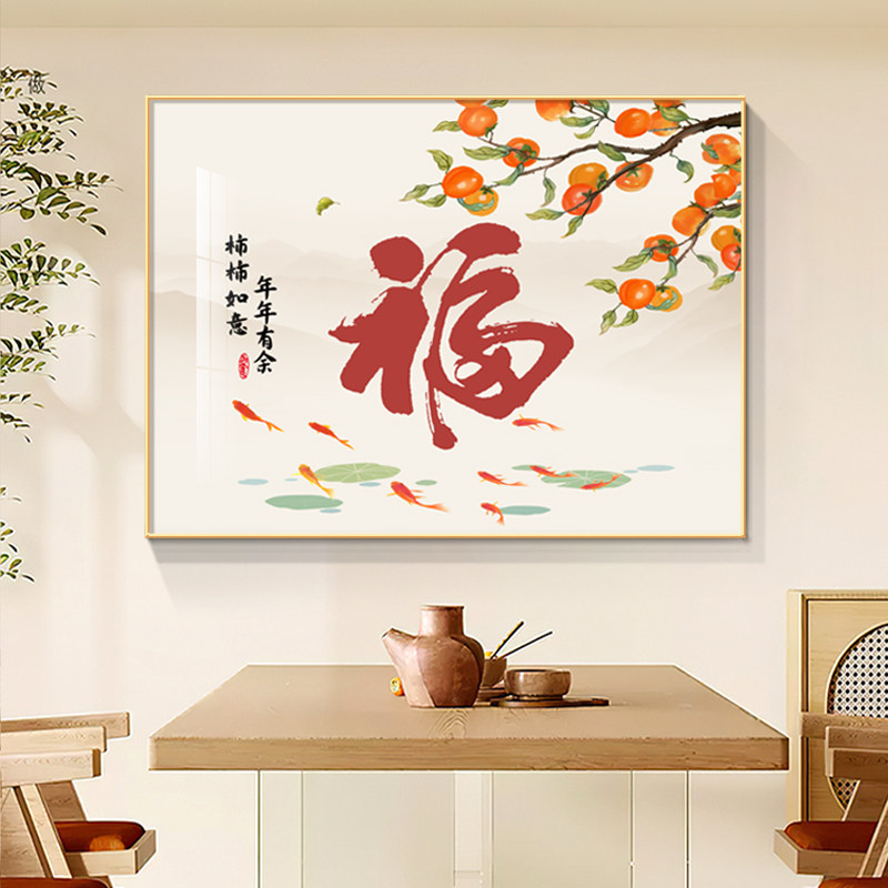 新中式餐厅背景墙装饰画柿柿如意福字寓意好饭厅卧室高级大气挂画