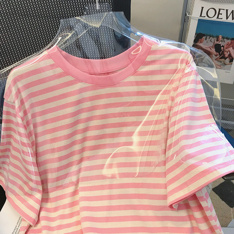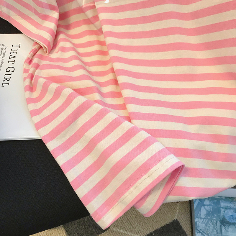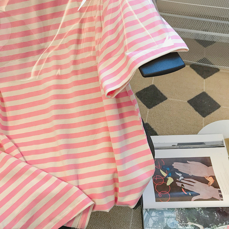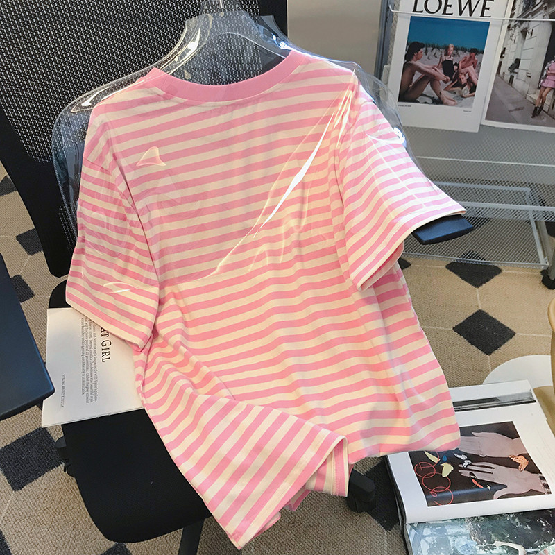 韩国东大门2024夏季新款韩版宽松粉色条纹短袖T恤女洋气百搭上衣