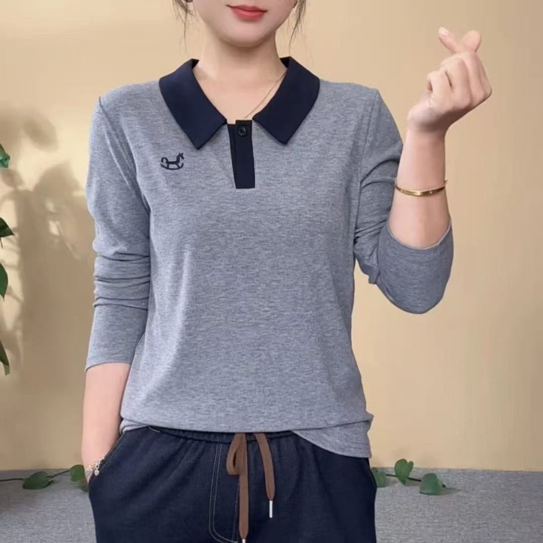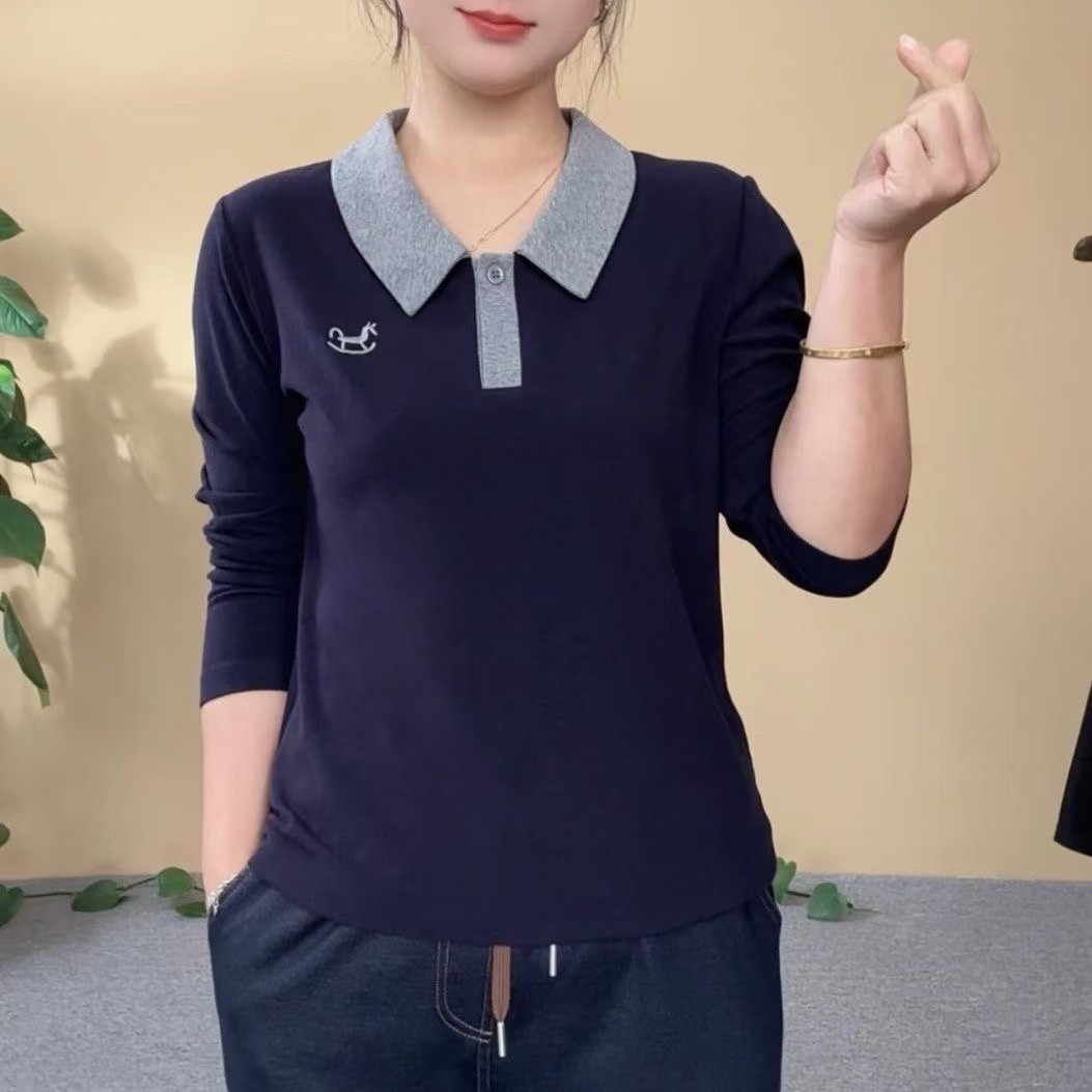 秋季新款长袖T恤衫休闲简约翻领小衫妈妈装短款春秋打底衫上衣女