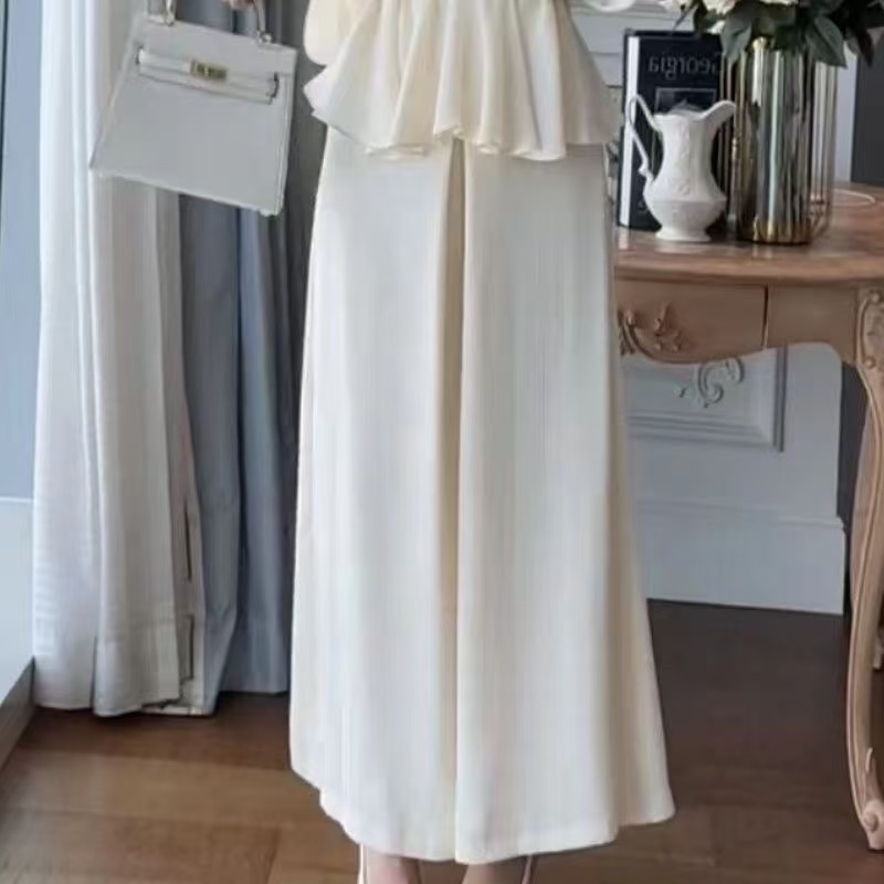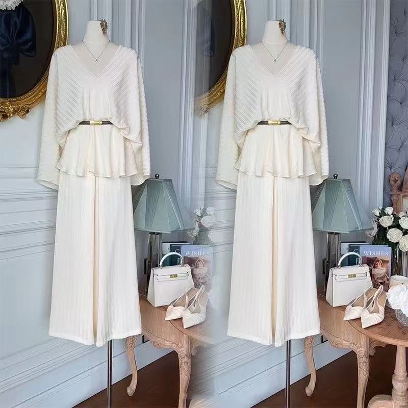 早秋穿搭一整套高级感气质v领上衣垂感阔腿长裤大方得体的两件套