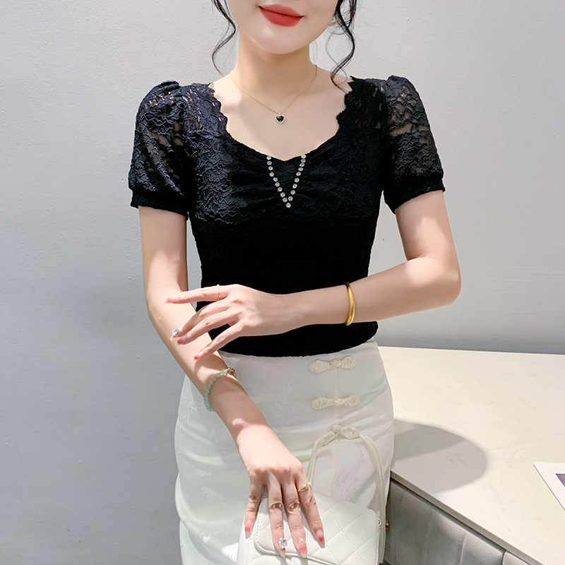 夏装性感镂空方领钉钻蕾丝衫短袖T恤女时尚修身显瘦泡泡袖上衣潮