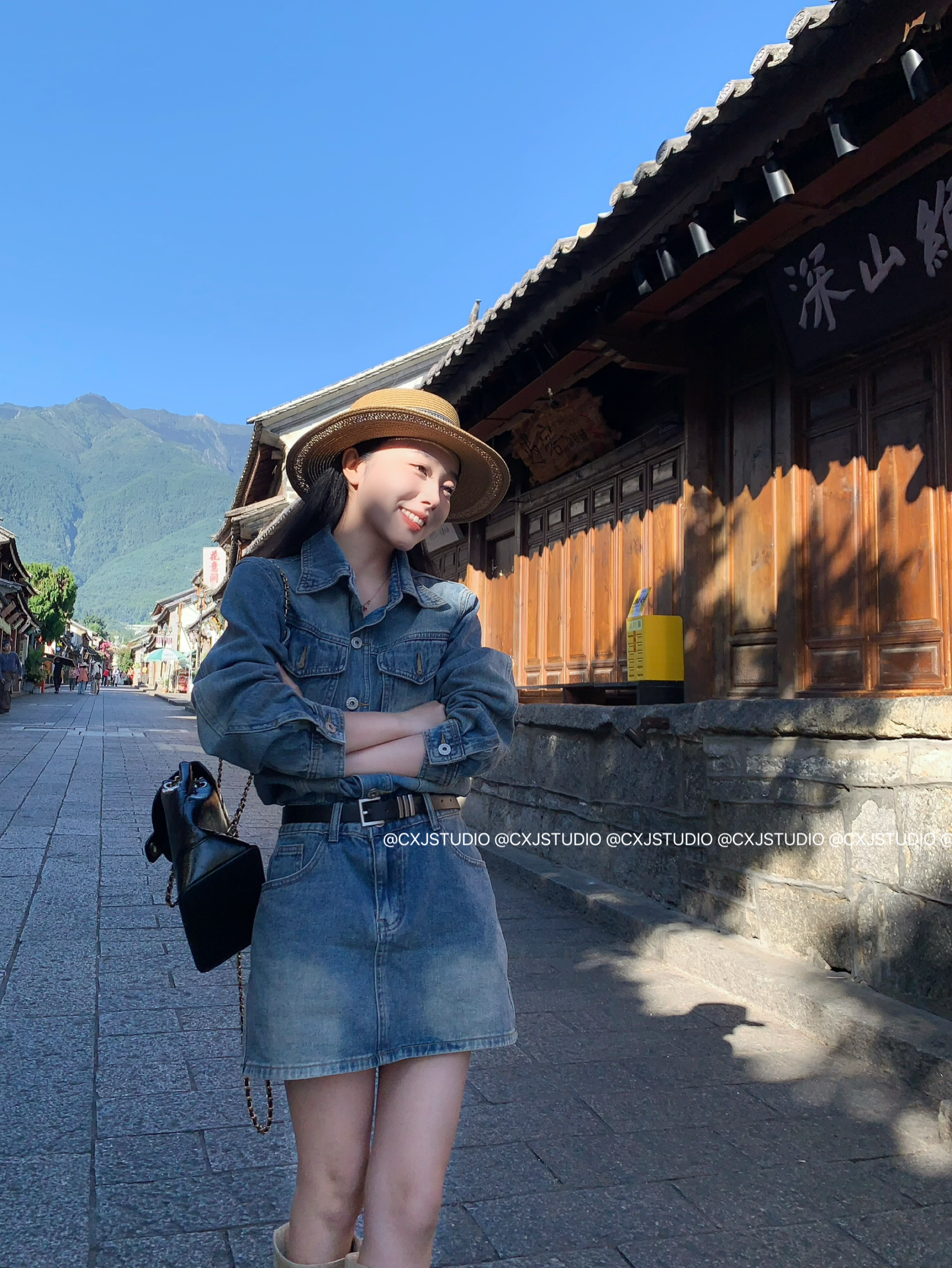 陈可爱2025复古蓝牛仔连衣裙女慵懒舒适通勤牛仔衬衫短裙连体套装