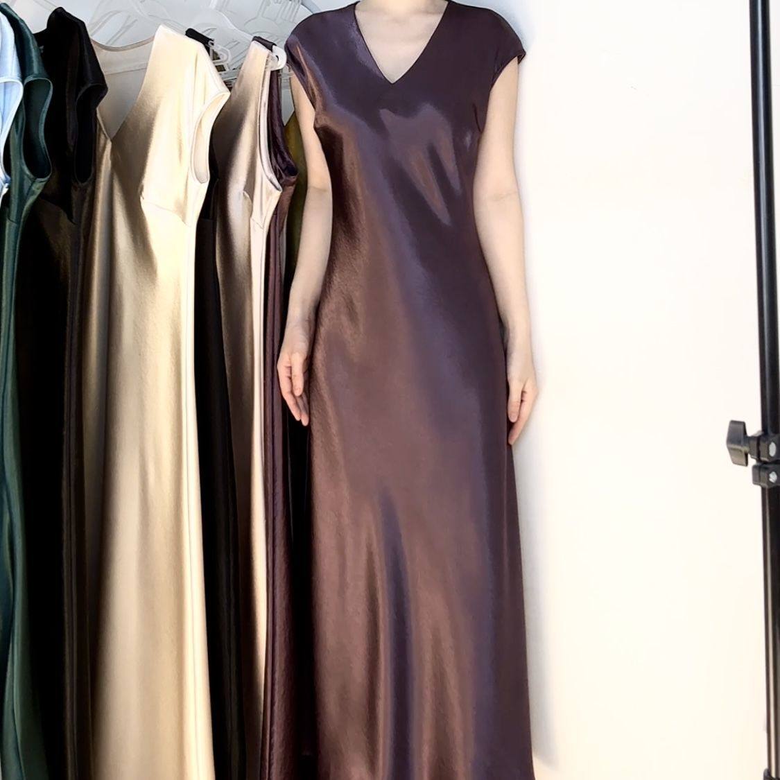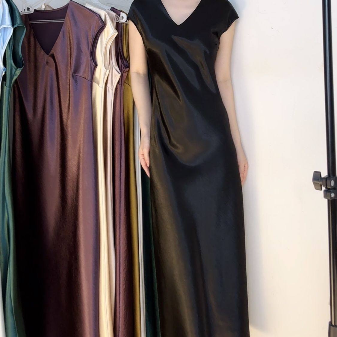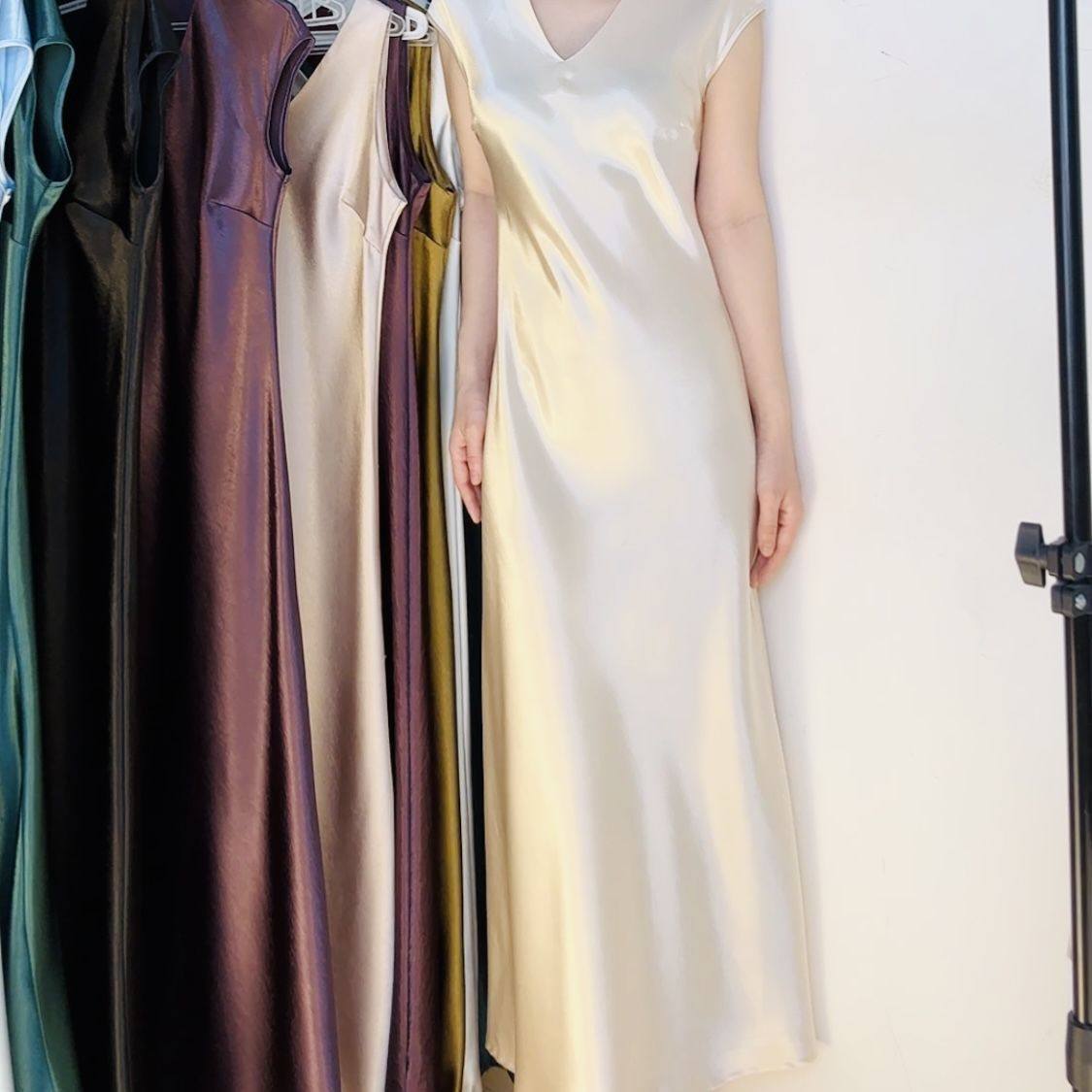 小盖袖V领高腰鱼尾裙长裙连衣裙修身气质缎面连衣裙