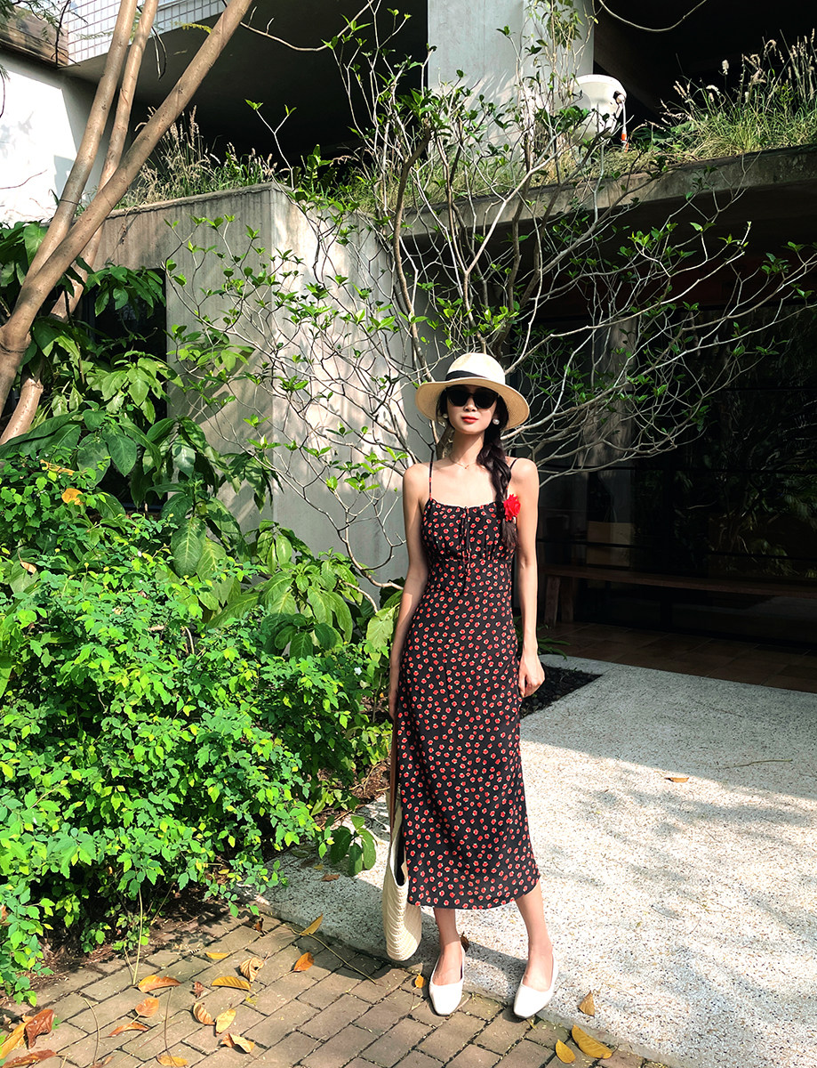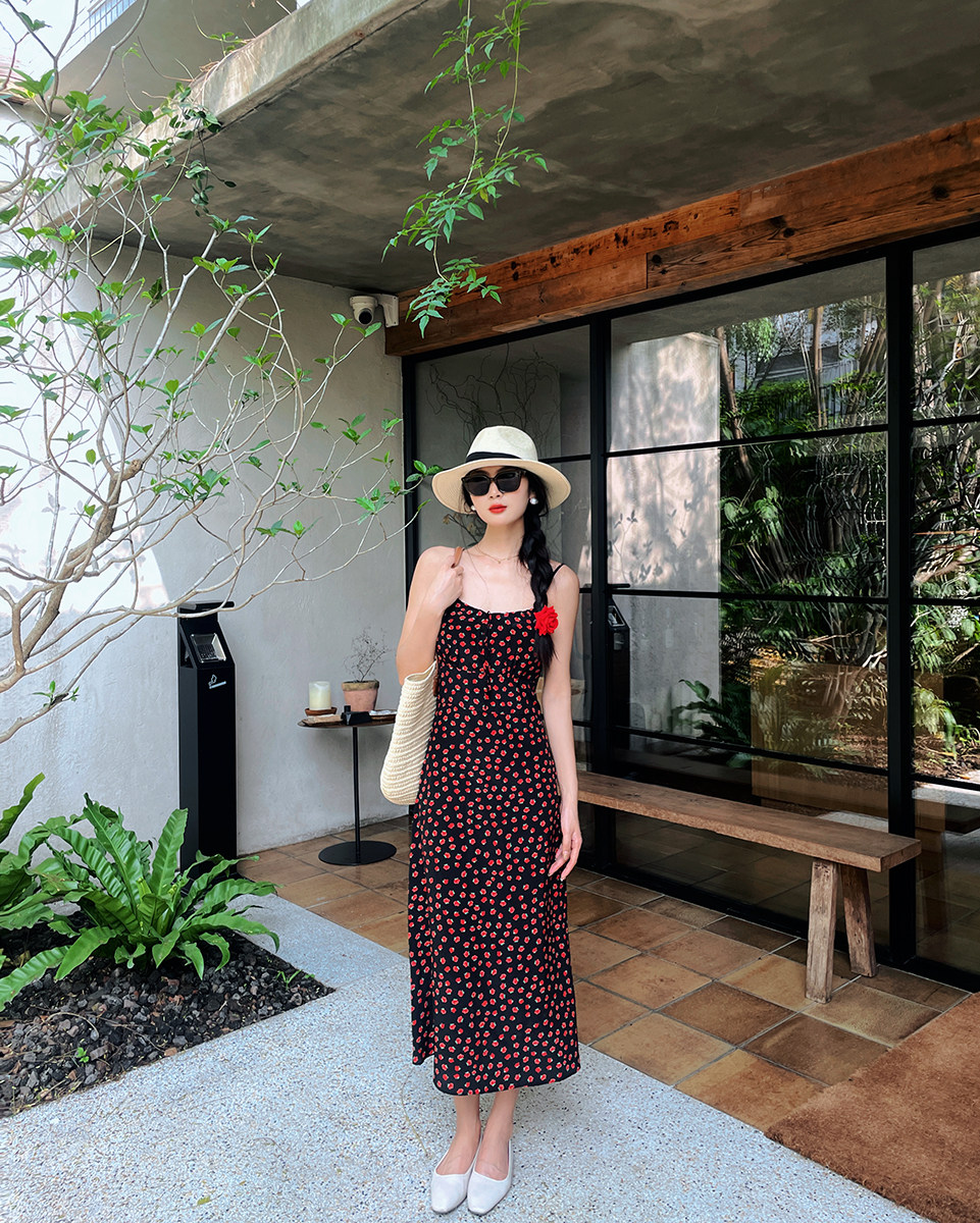 小鱼自制 24夏新法式真丝吊带连衣裙中长款裙子 暗夜玫瑰印花
