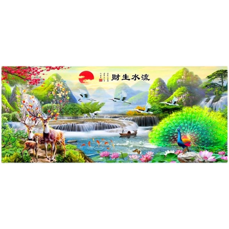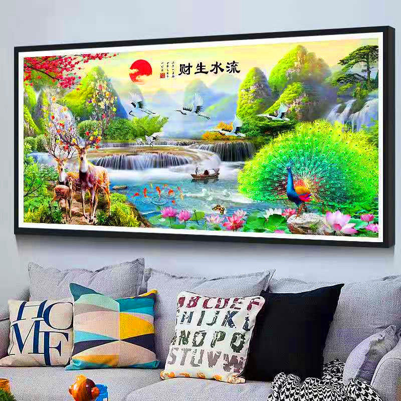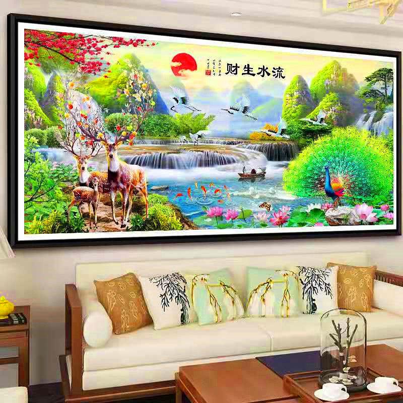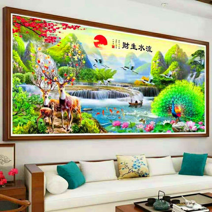 彩珠绣十字绣客厅山水画全珠子绣流水生财串珠麋鹿丝线绣穿珠孔雀