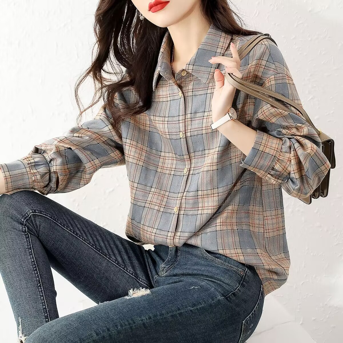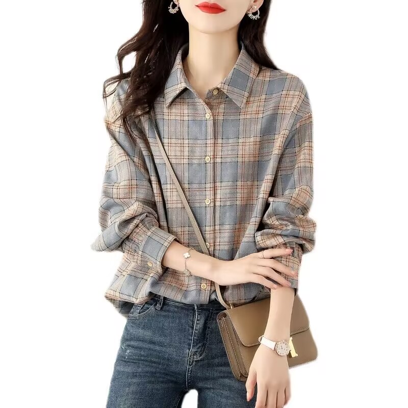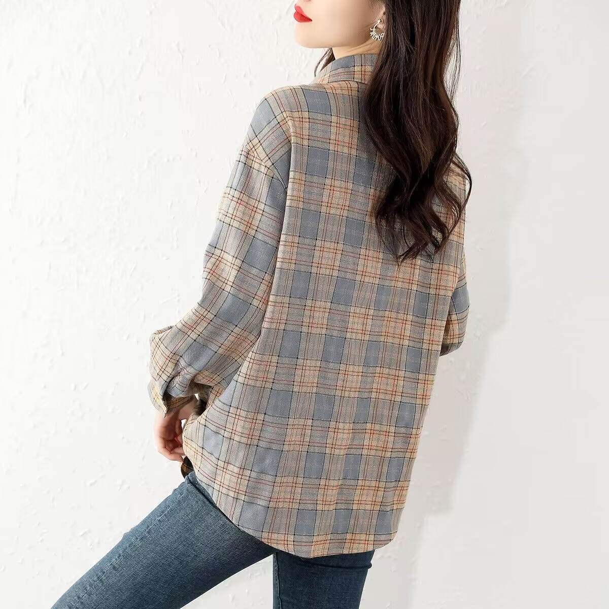 磨毛格子衬衫女长袖上衣2023年春季复古时髦港味格子宽松衬衫