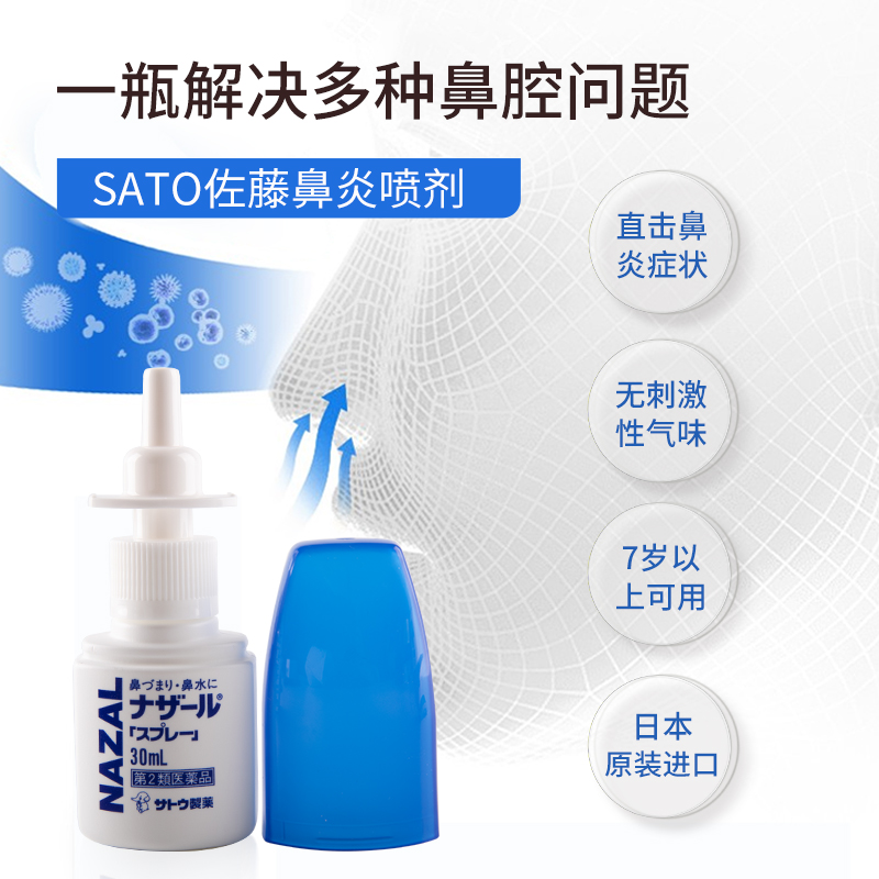 日本Sato佐藤鼻炎喷雾剂蓝色30ml鼻塞通鼻喷过敏性鼻炎药正品进口