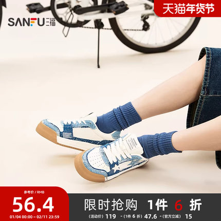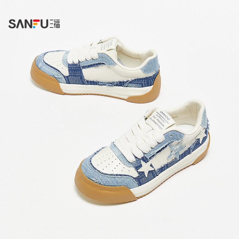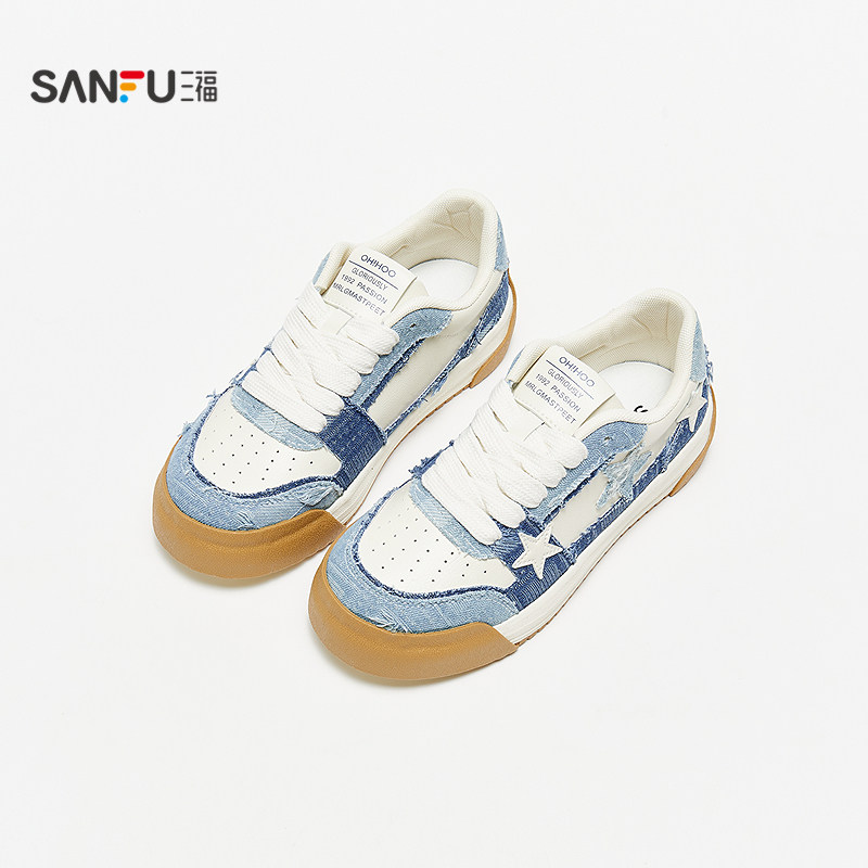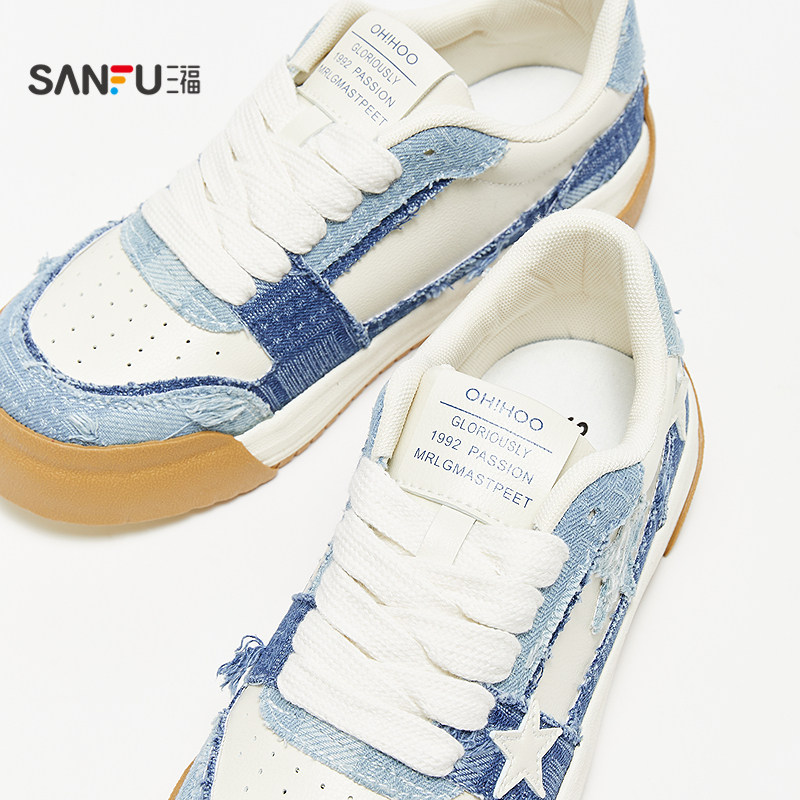 三福低帮板鞋女夏季街头牛仔拼接毛边五角星休闲女鞋839463