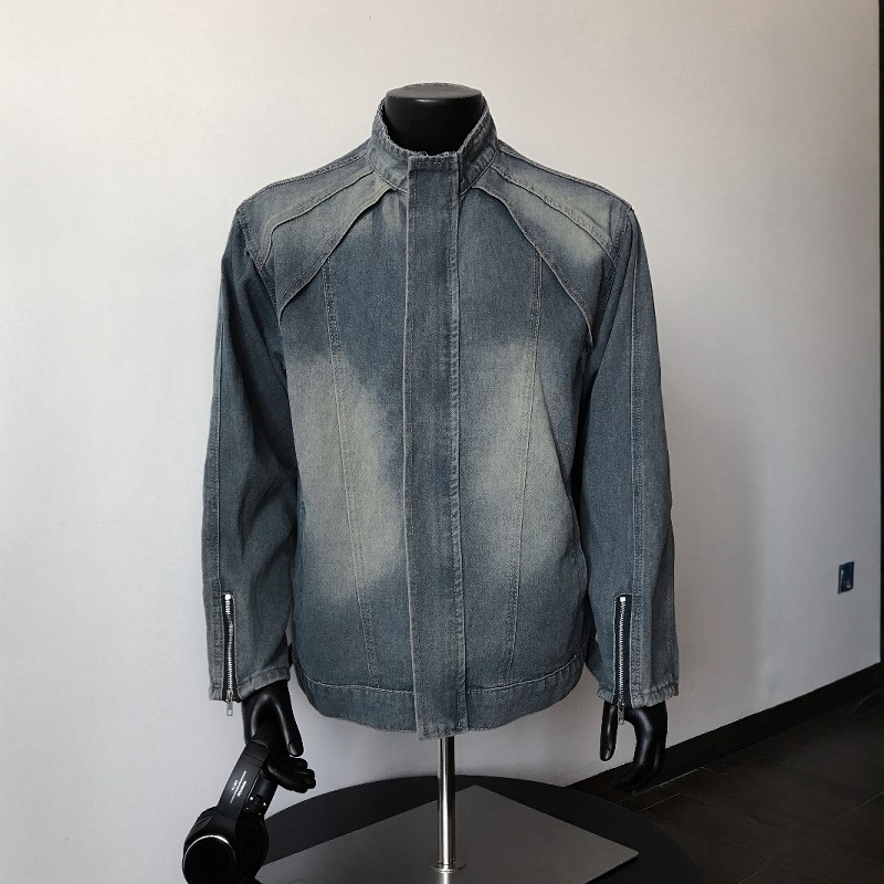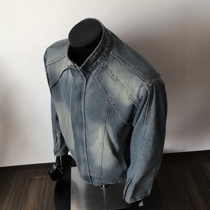 美式复古水洗做旧黄泥染立领牛仔夹克男春秋季痞帅宽松拉链外套潮