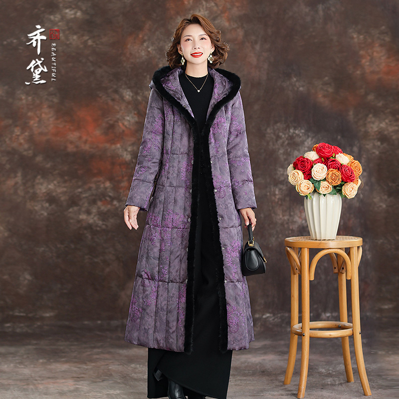 新中式提花鹅绒服妈妈羽绒服冬装2025新款加厚长款过膝连帽外套女