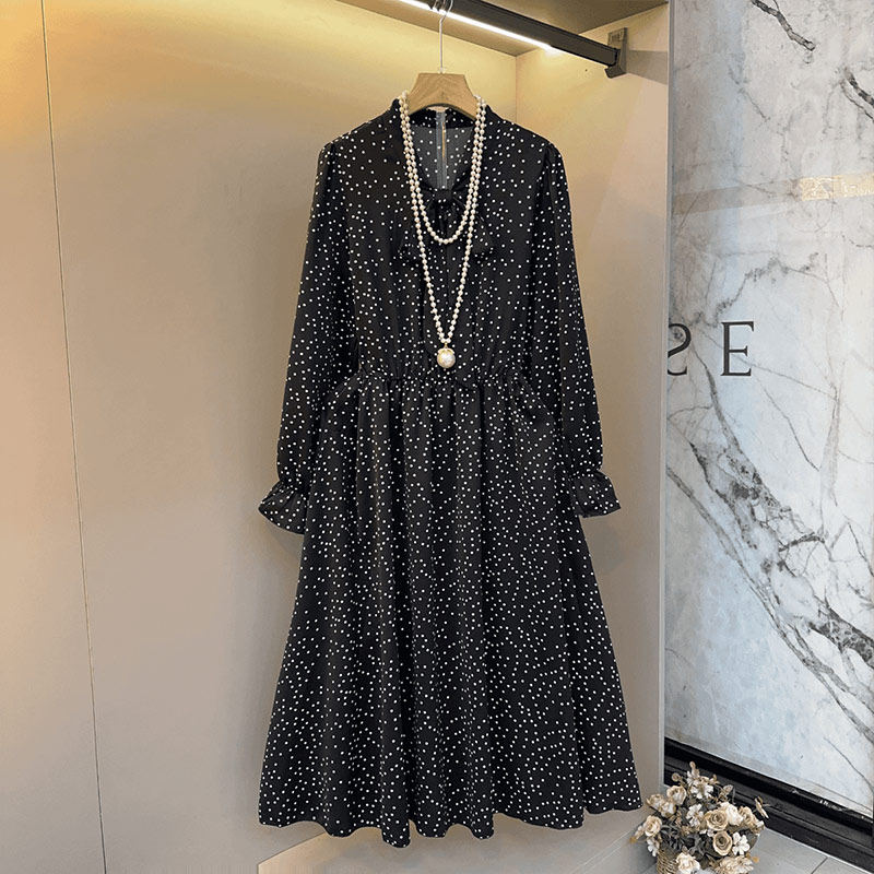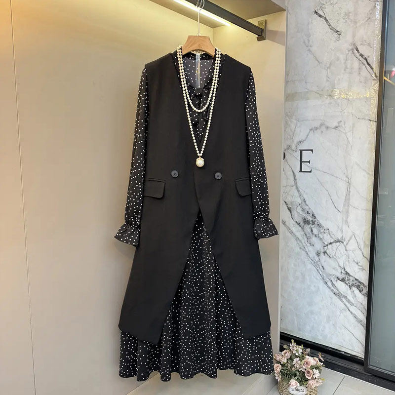 大码女装长款开叉马甲波点连衣裙