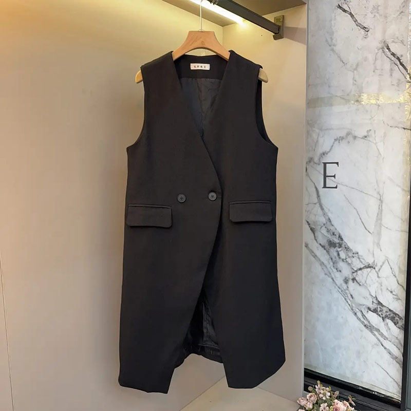 胖妹妹V领两粒扣长款开叉马甲简约加大码女装复古休闲波点连衣裙