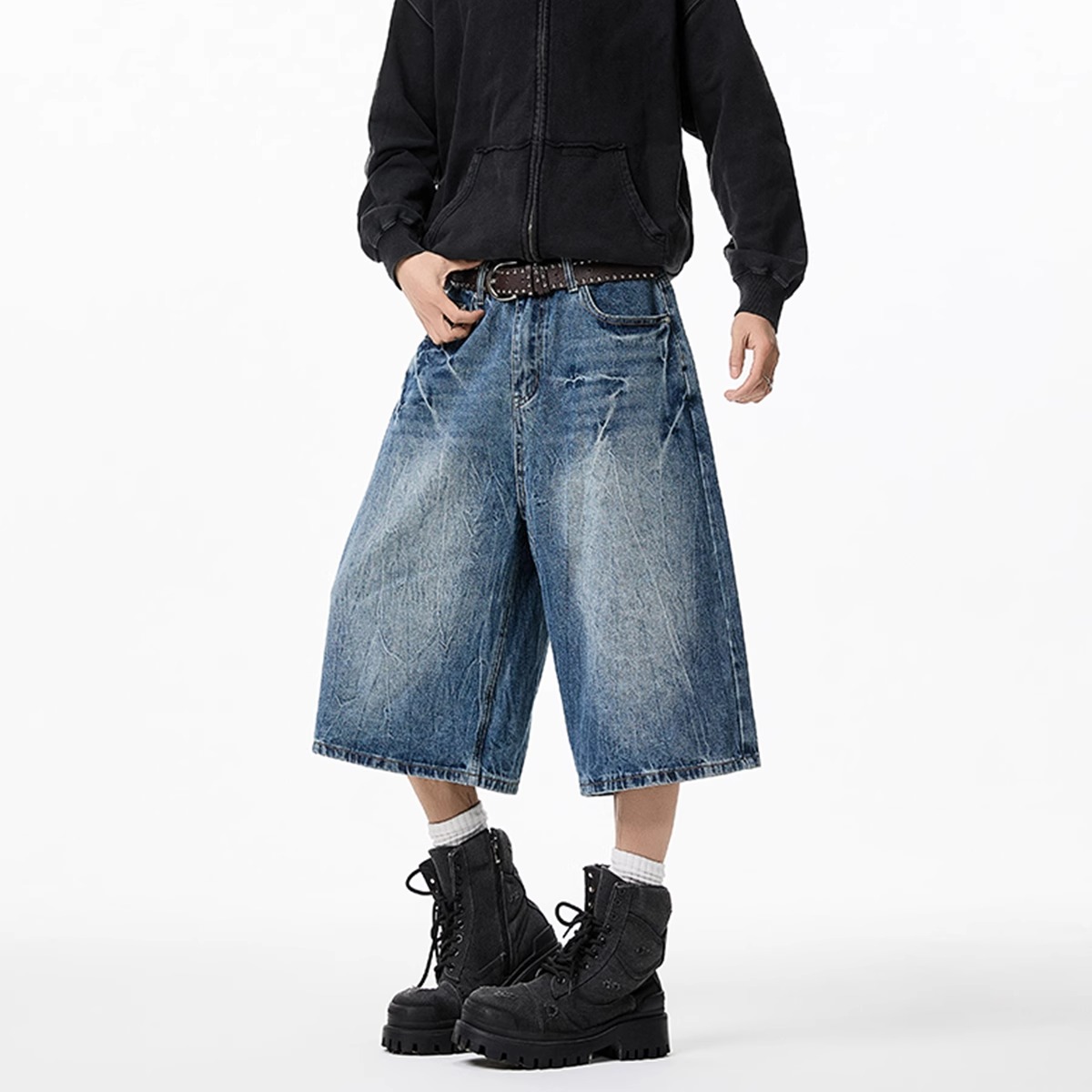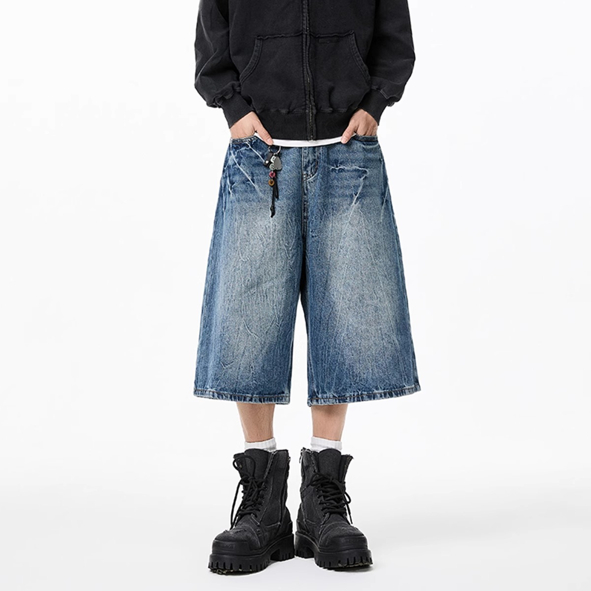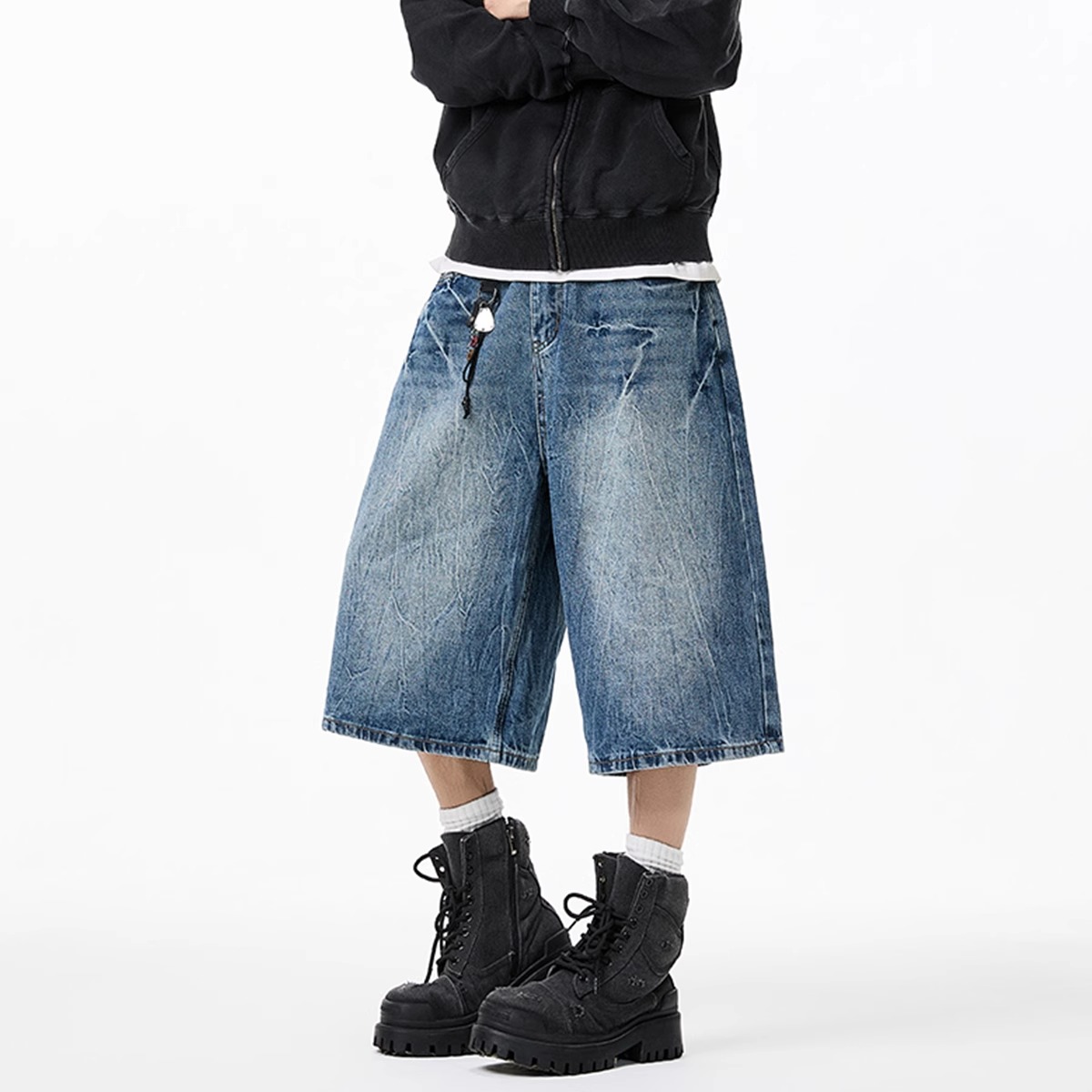 美式高街闪电纹牛仔短裤男生夏季薄款痞帅宽松阔腿直筒七分裤中裤