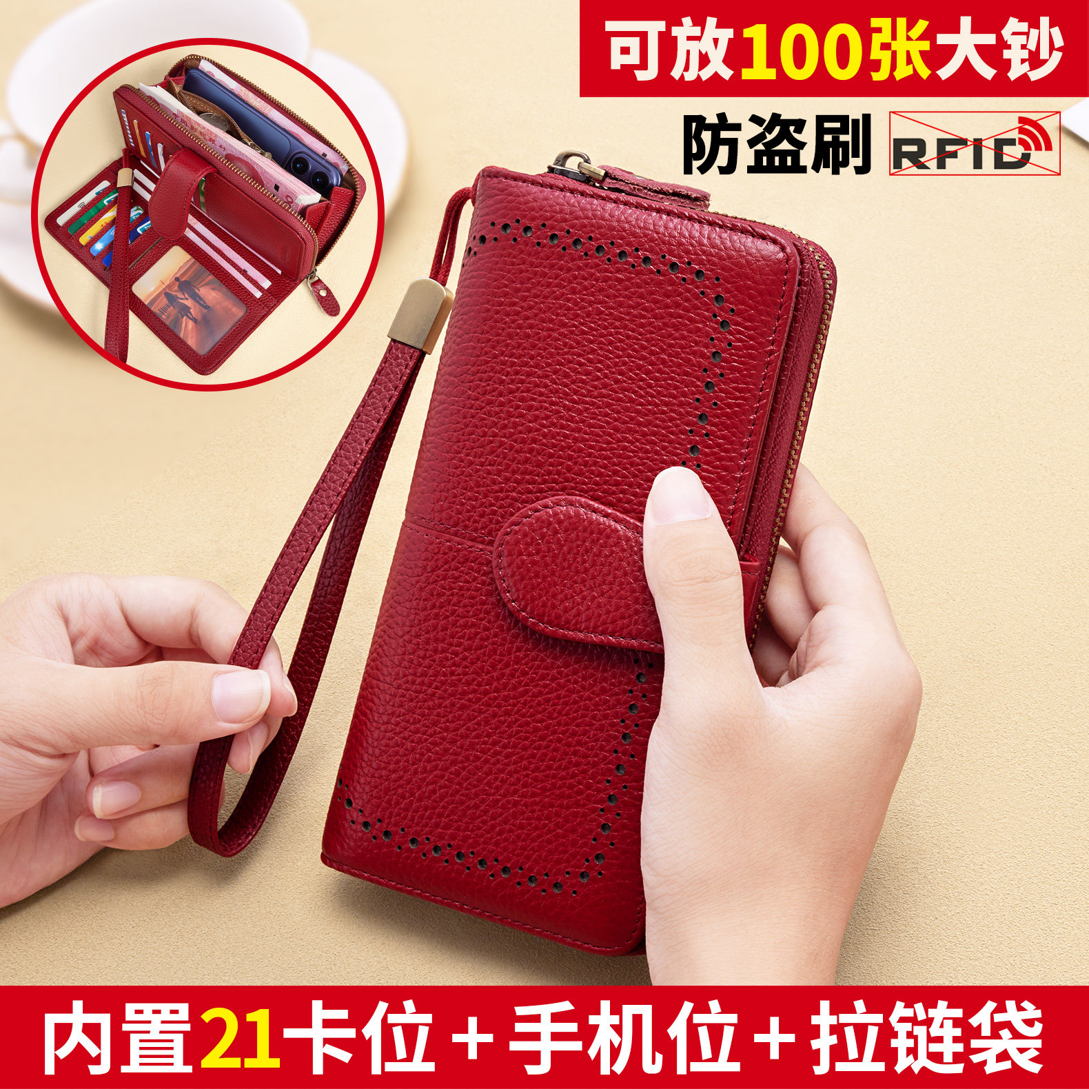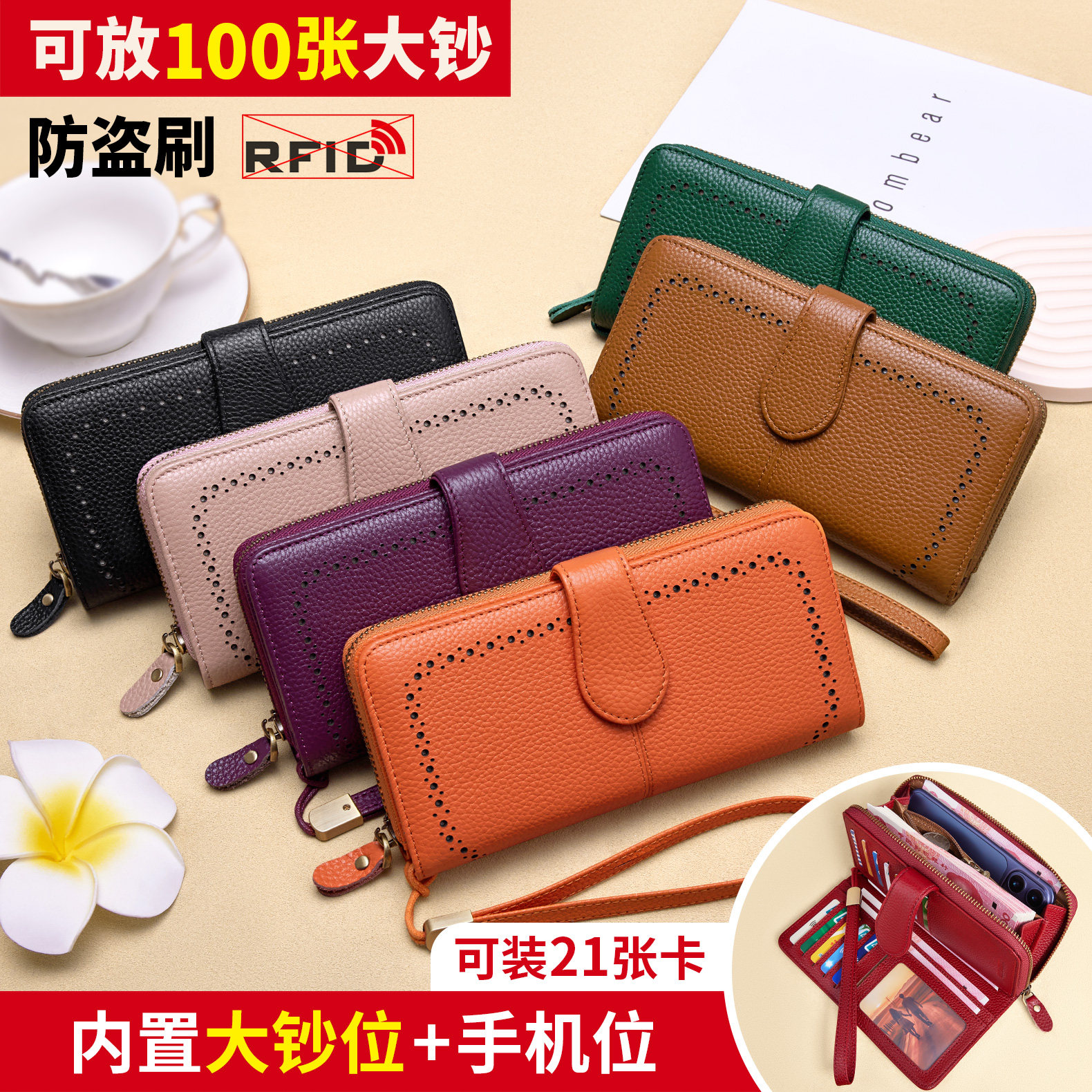 新款头层牛皮荔枝纹钱包女长款大容量多功能多卡位真皮手拿包女