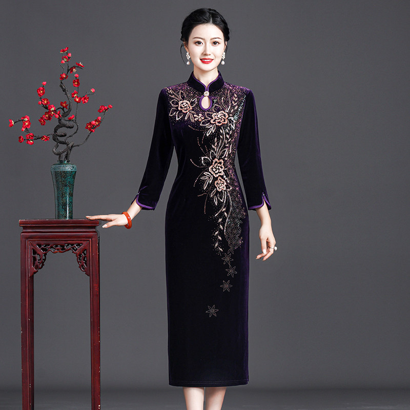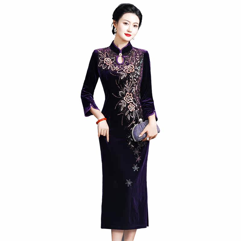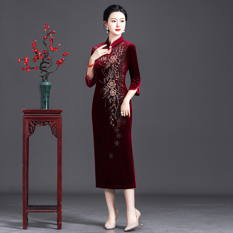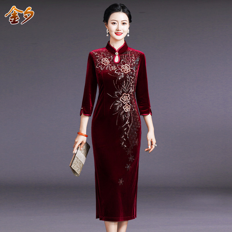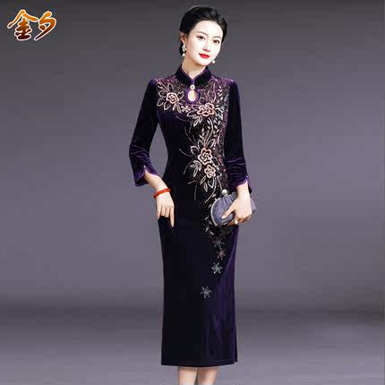 妈妈装婚礼服宴会旗袍中长款显瘦大码中老年女装金丝绒春秋连衣裙