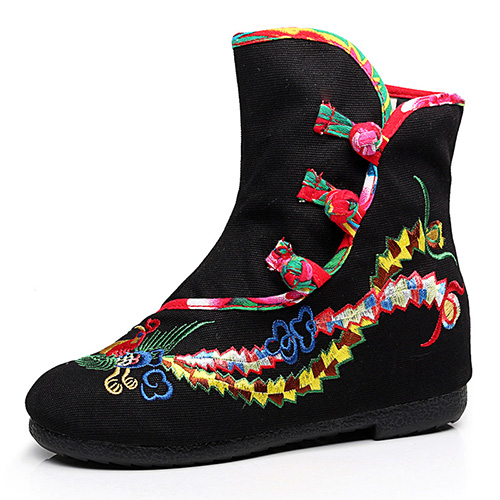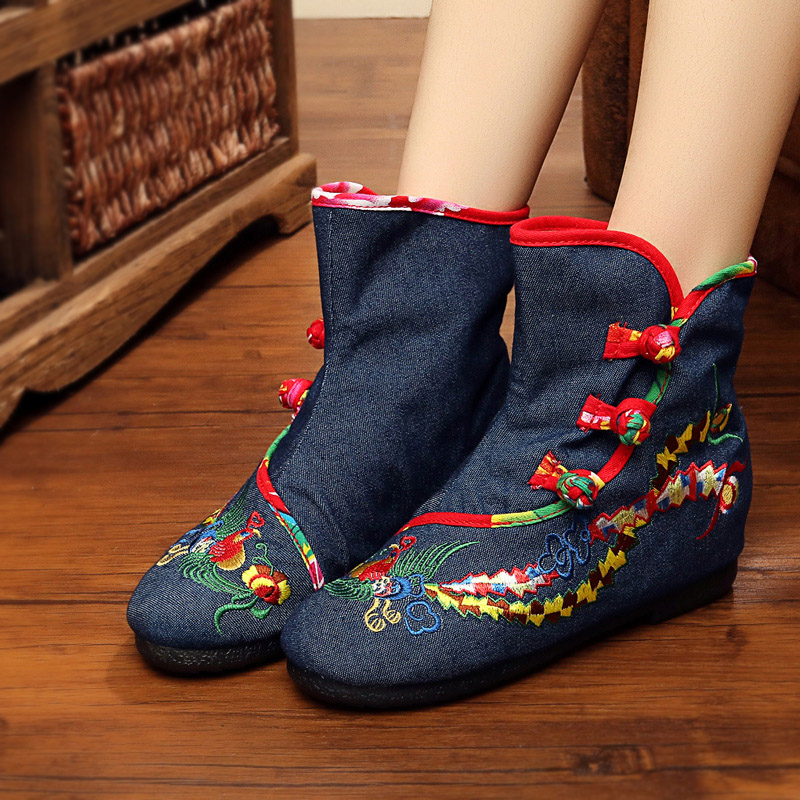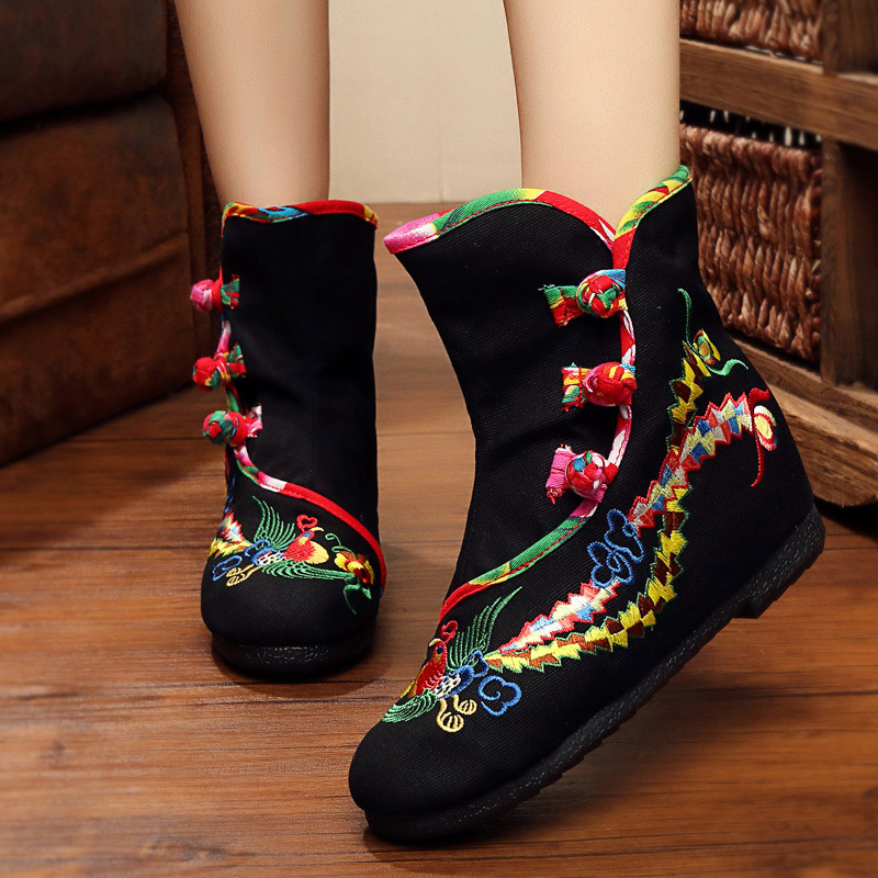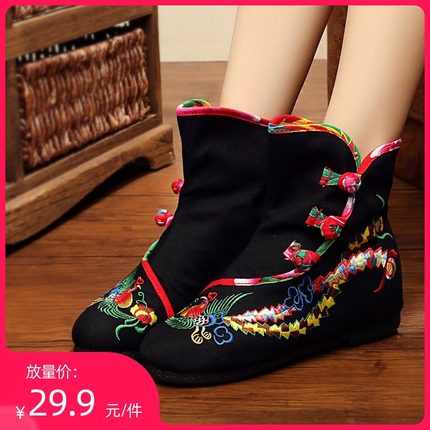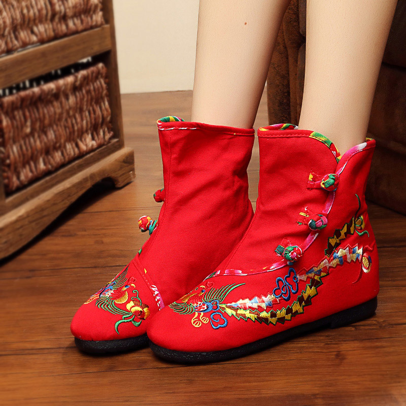 北京老布鞋女平底民族风绣花鞋短靴马丁靴圆头内增高彩凤靴女靴子