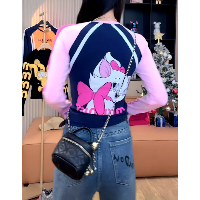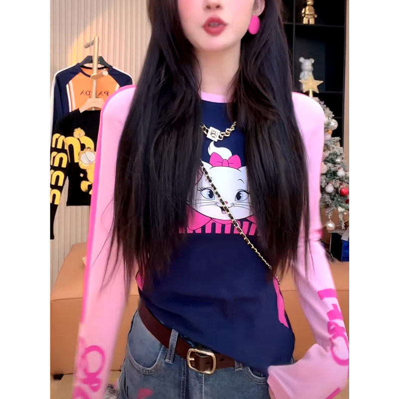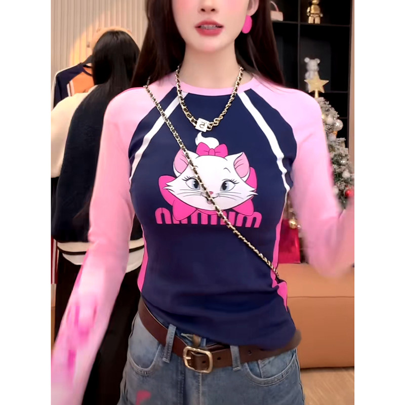 蝴蝶结猫咪字母印花圆领T恤卡通减龄拼接修身长袖2024秋季打底衫