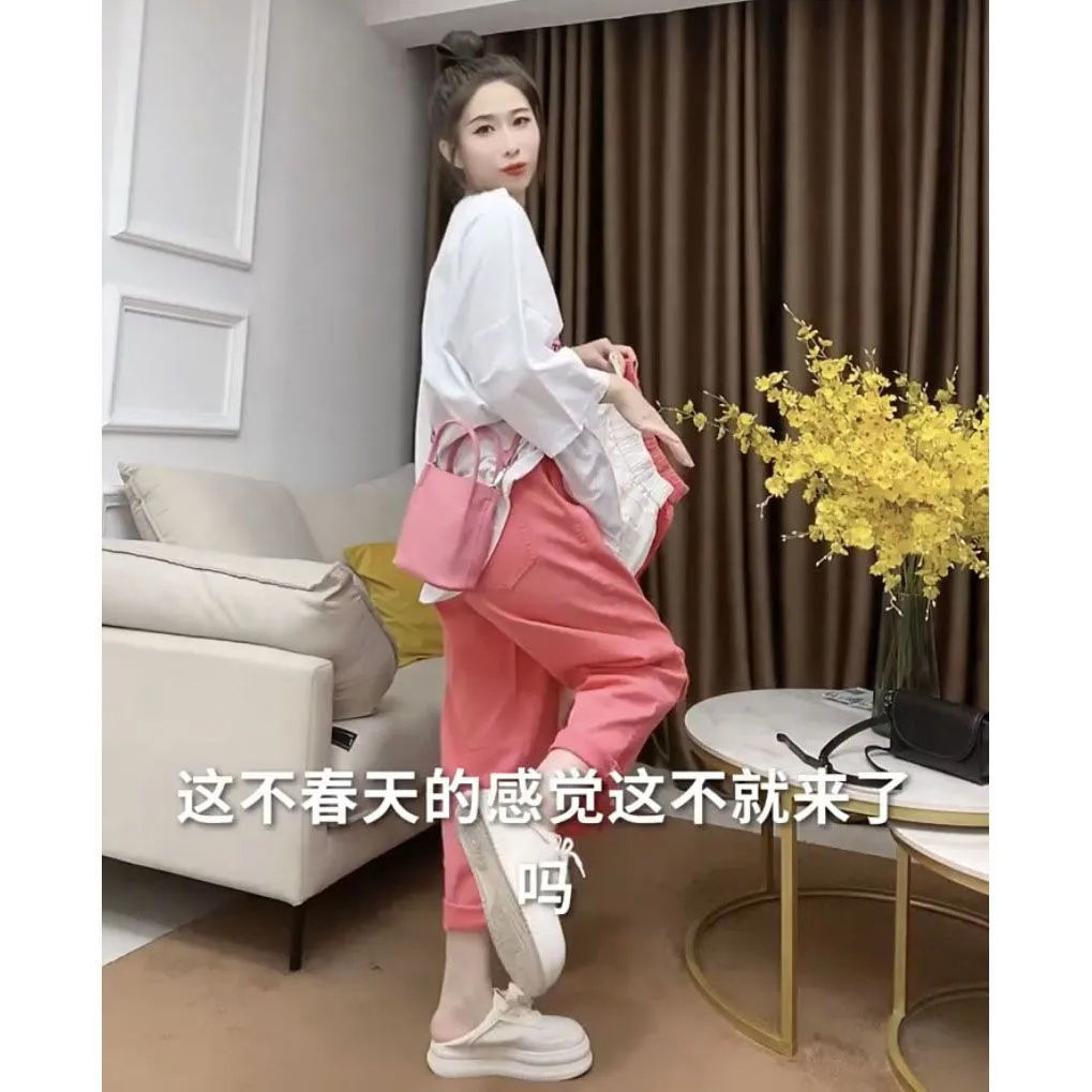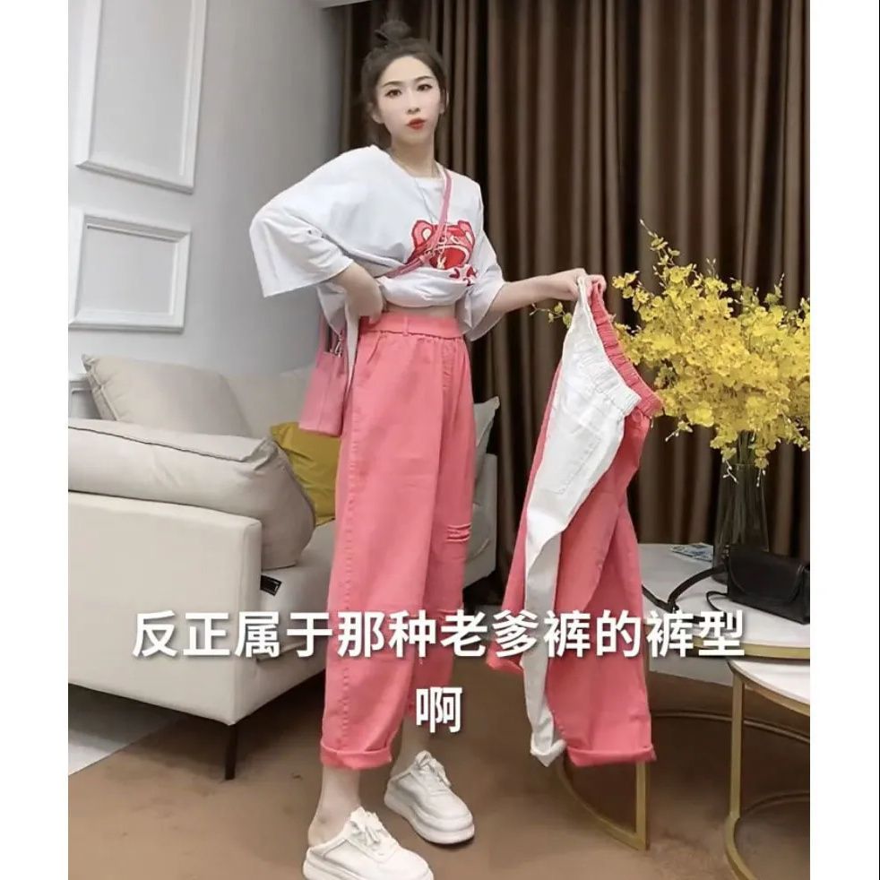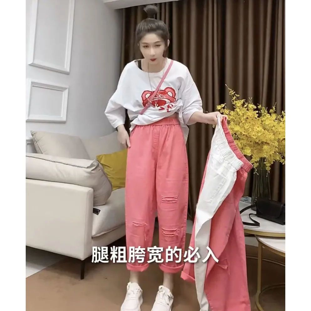 特大码胖mm假破洞九分牛仔裤女2025新款粉色显瘦直筒老爹哈伦裤子