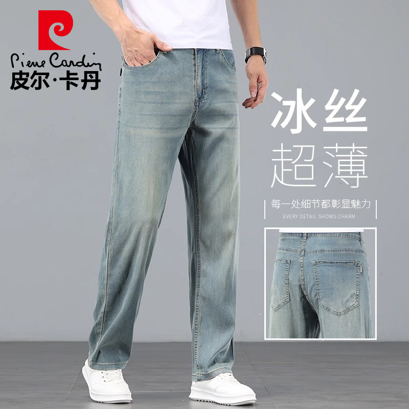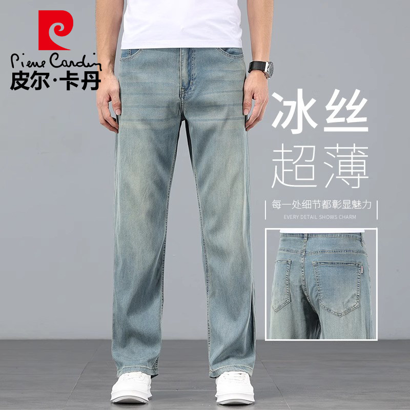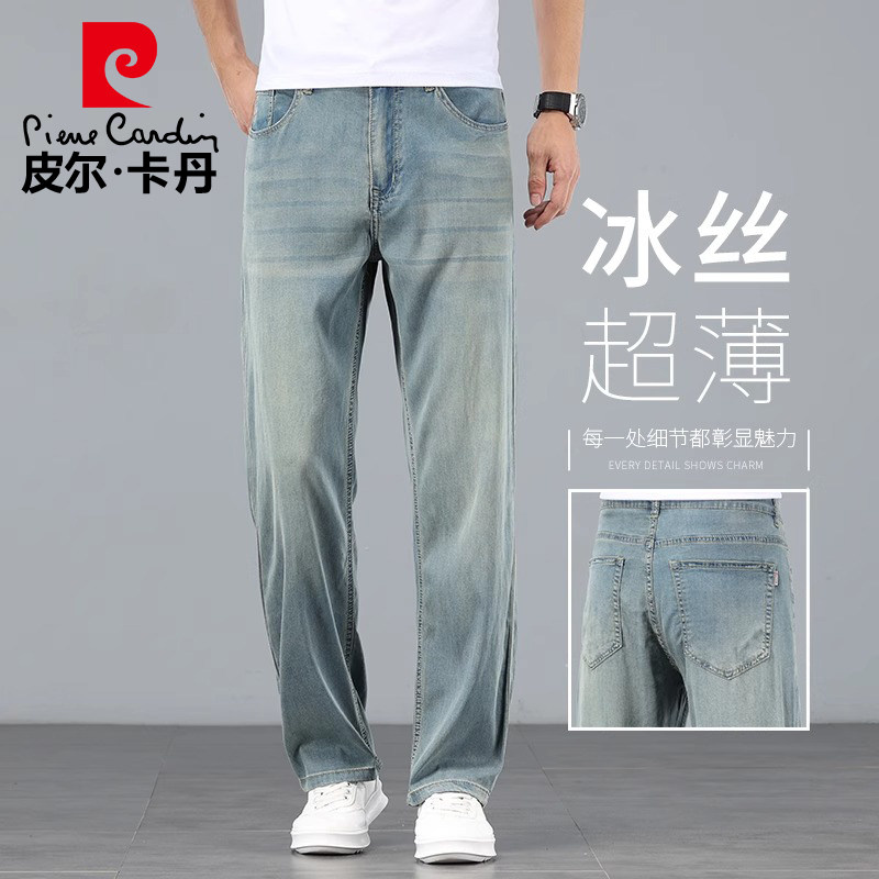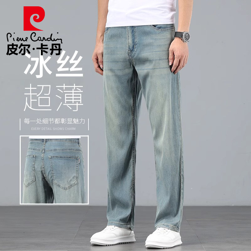 皮尔卡丹高端天丝牛仔裤男士夏季薄款直筒宽松冰丝超薄弹力长裤子